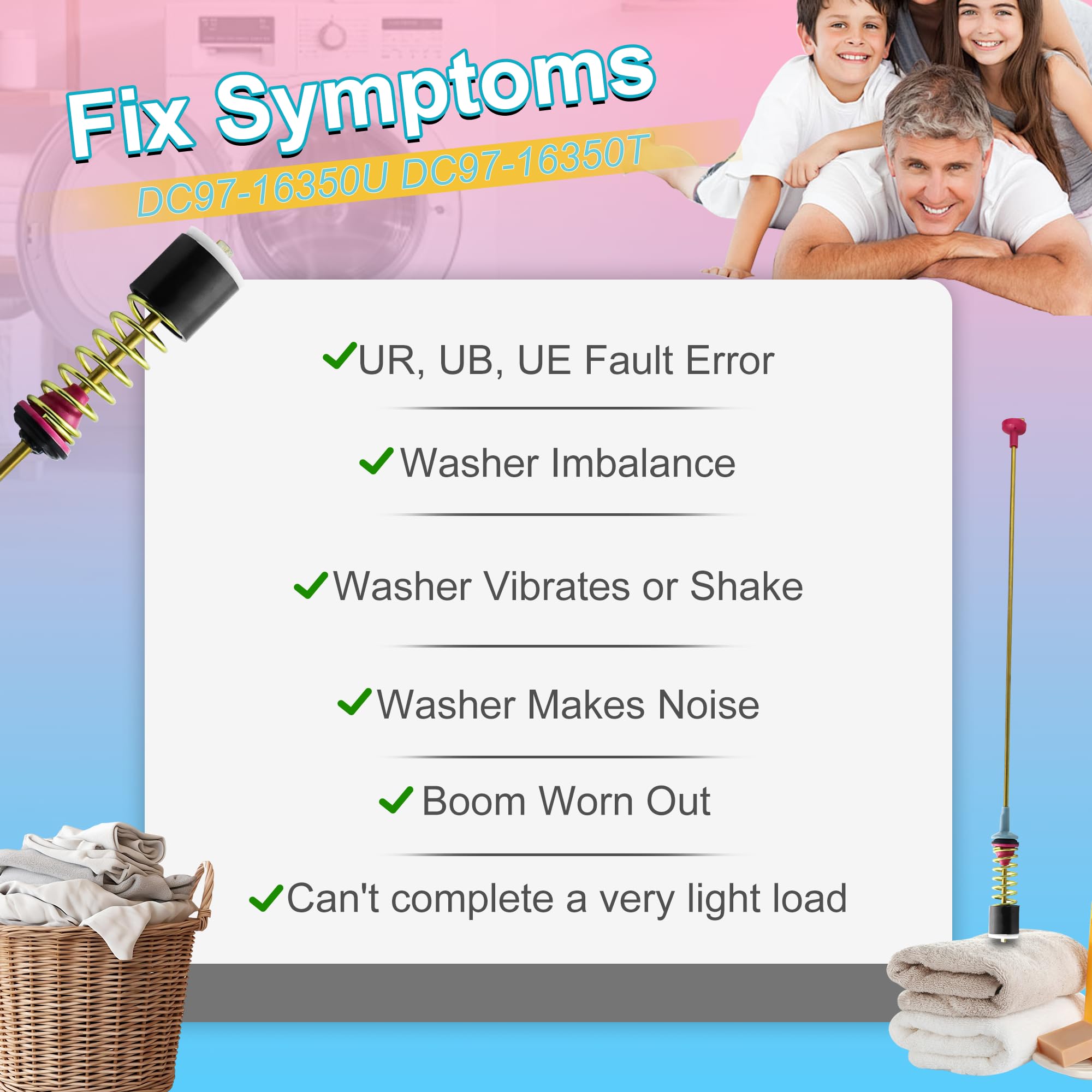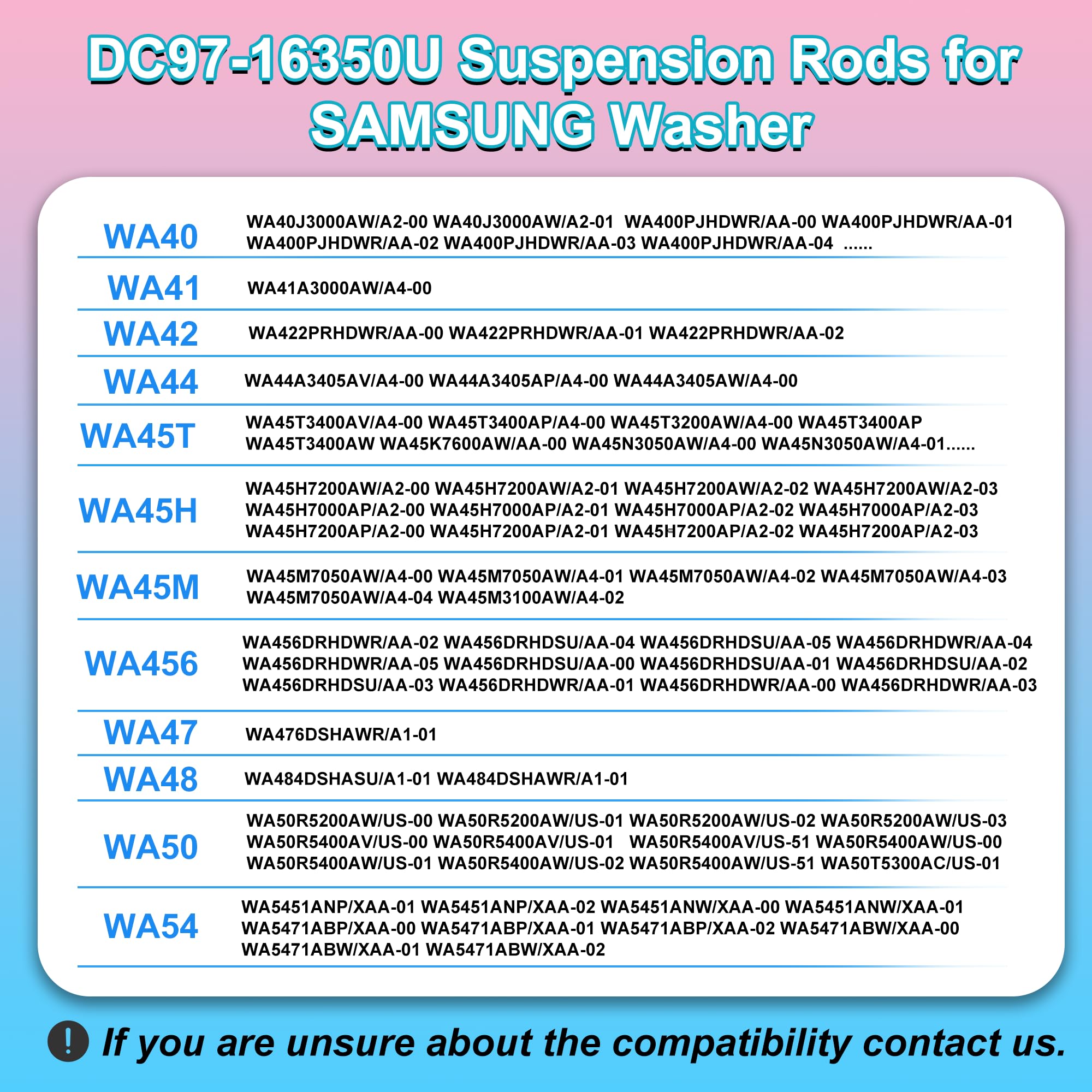 γπππππππππ & πππππ ππππ ππππππγWA50R5200AW/US Washer Suspension rods Provides stable support for the washer tub to maintain balance during operation. Solves 4 key washer issues: β Eliminates violent vibration/shaking; β‘ Resolves unbalanced load errors; β’ Reduces loud banging noise during spin cycles; β£ Fixes failure to complete light load cycles. Also addresses DC/UR/UE/UB/UL error codes caused by unbalanced washers, restoring your Samsung washer to like-new performance.