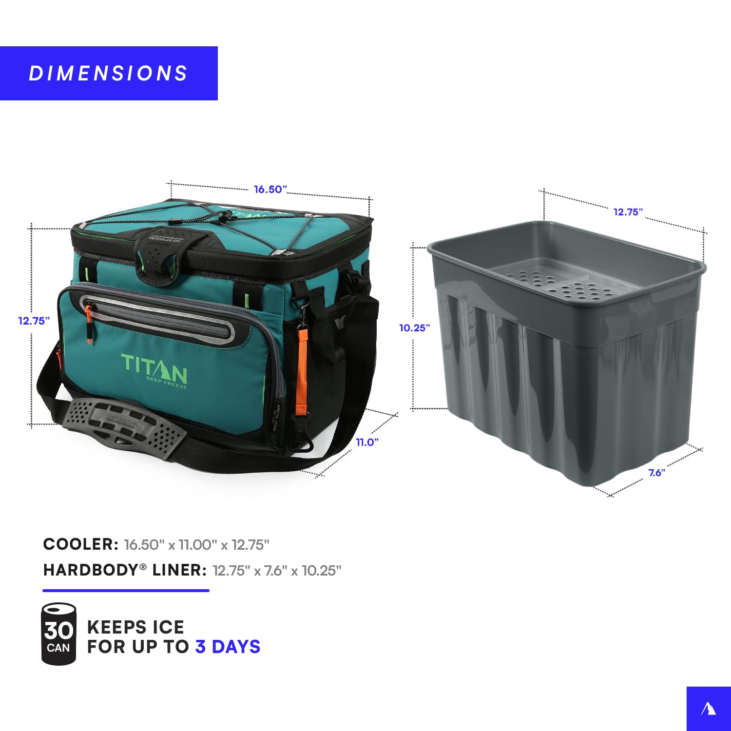 TITAN DEEP FREEZE ZIPPERLESS HARDBODY COOLER: Zipperless cooler features a patented, "flip-open" Zipperless lid for quick access to food and drinks; Keeps ice up to two days and holds up to 30 cans