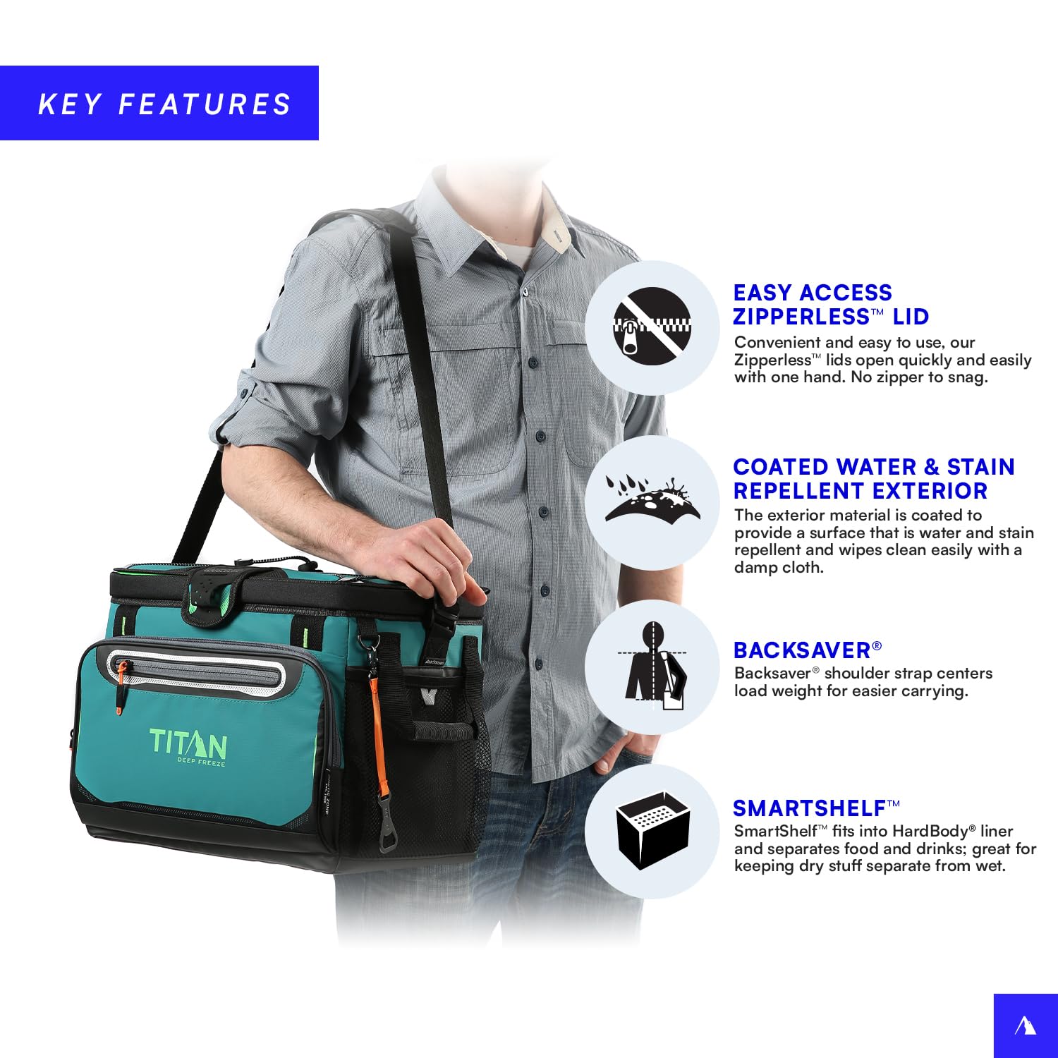 DESIGNED FOR CONVENIENCE AND USABILITY: Cooler features an adjustable Backsaver shoulder strap with an anti-slip shoulder pad for carrying comfort and rugged exterior material that is water- and stain-repellent and easy to wipe clean