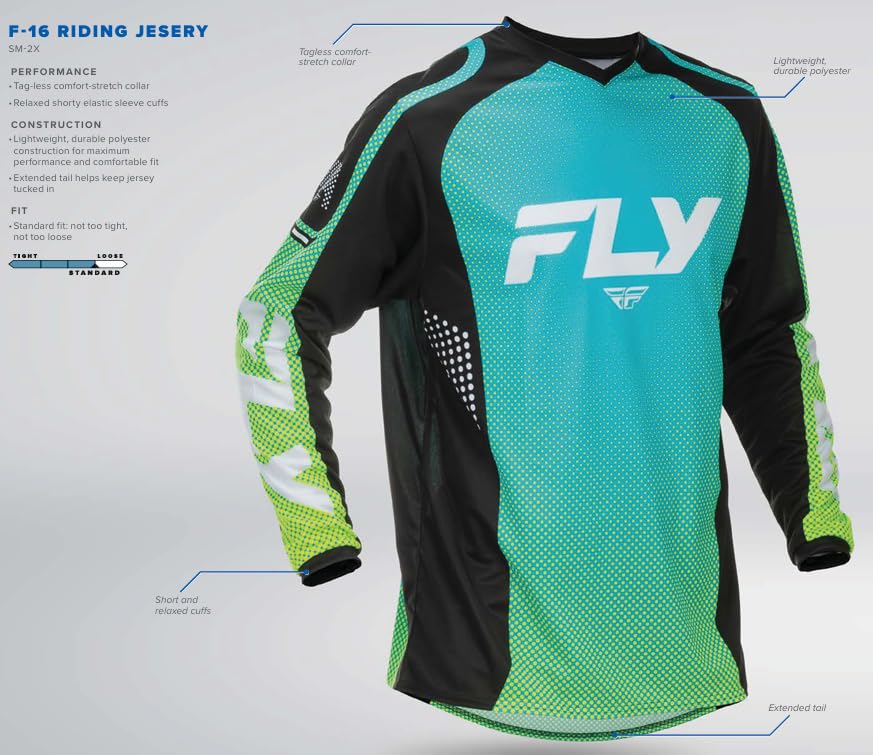 Description The Fly Racing F-16 Jersey is a versatile and comfortable choice for riders looking for a motocross jersey, mtb jersey, dirt bike jersey, cycling jersey, or BMX gear. Its tag-less comfort-stretch collar eliminates irritation, while relaxed shorty elastic sleeve cuffs provide freedom of movement. Built from lightweight yet durable polyester, this jersey delivers both performance and longevity. An extended tail keeps it securely tucked in, even during intense rides, and the standard fit strikes the perfect balance between snug and relaxed, making it ideal for riders who want comfort, style, and reliability in one package.
