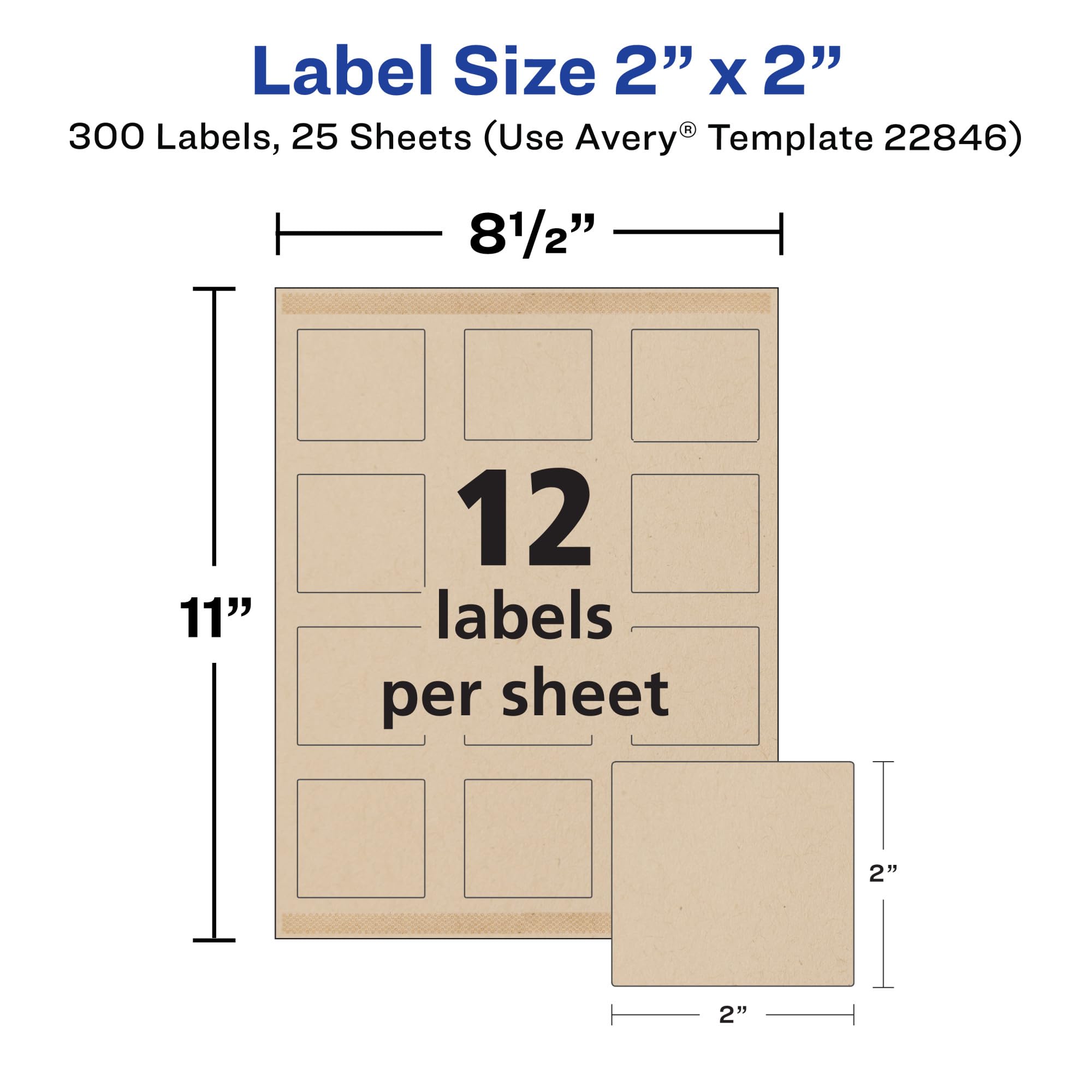 Easily add a rustic touch to any project or event with Avery 22846 Kraft Brown 2" x 2" Labels. Made with a matte, kraft brown paper, these charming labels are perfect for product branding labels, wedding labels, goodie bag labels, and more. These recycled paper labels are made with 100% post-consumer recycled paper that is processed chlorine-free to substantially reduce the number of harmful substances used during the manufacturing process. The paper labels and packaging are recyclable as part of paper waste (dispose of backing sheet separately). Avery labels with patented Sure Feed technology provide a more reliable feed through your printer, reducing misalignments and jams. Create beautiful designs that reach the edges of the labels with the print to the edge layout. The permanent adhesive labels makes sure that your labels stick securely to paper, cardboard, plastic, glass, painted metal, and more. The permanent labels are also designed to prevent peeling and curling. Design and print your own personalized labels with the templates on the Avery site.