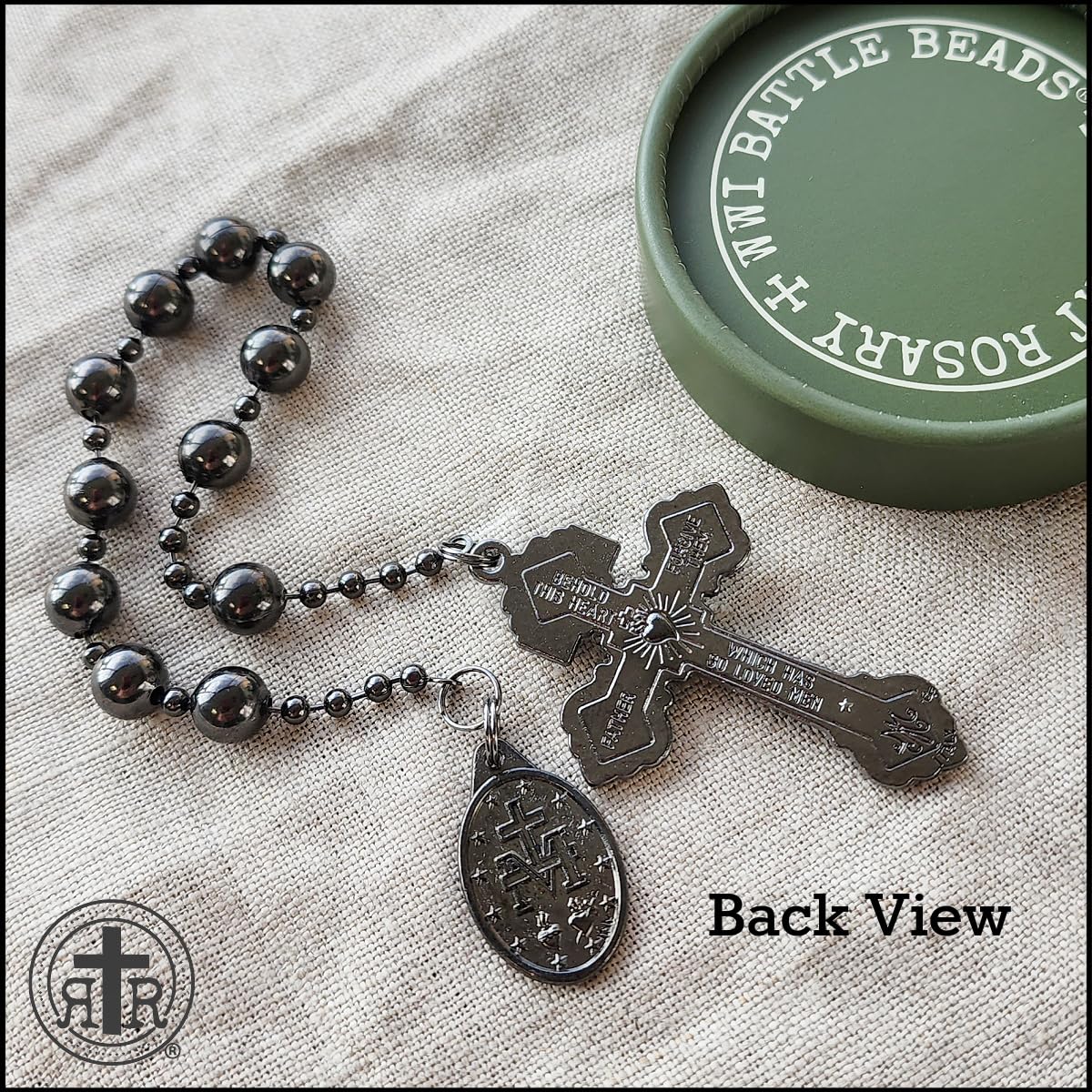 【CRAFTSMANSHIP】These WWI Battle Beads Rosaries are the original Battle Beads handmade by the Rugged Rosaries’ artisans in our Texas studio since 2012. We use brass ball chains with gunmetal patina. They are strong, non-magnetic, non-corrosive, and weighty feeling. The beads are slightly larger to aid your meditative prayer. The beads glide smoothly through your fingers.