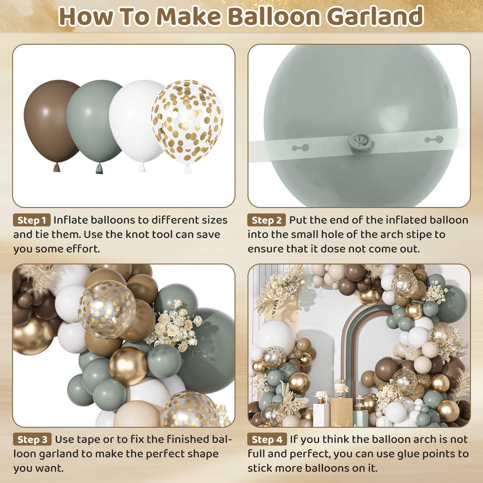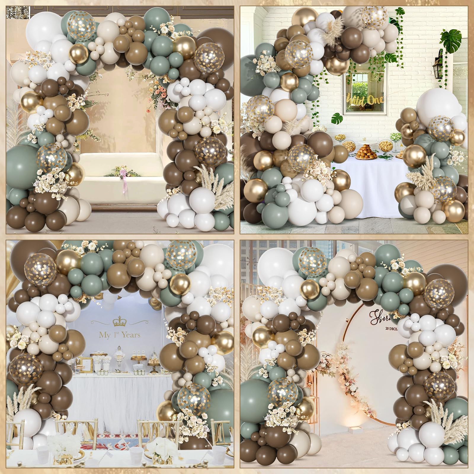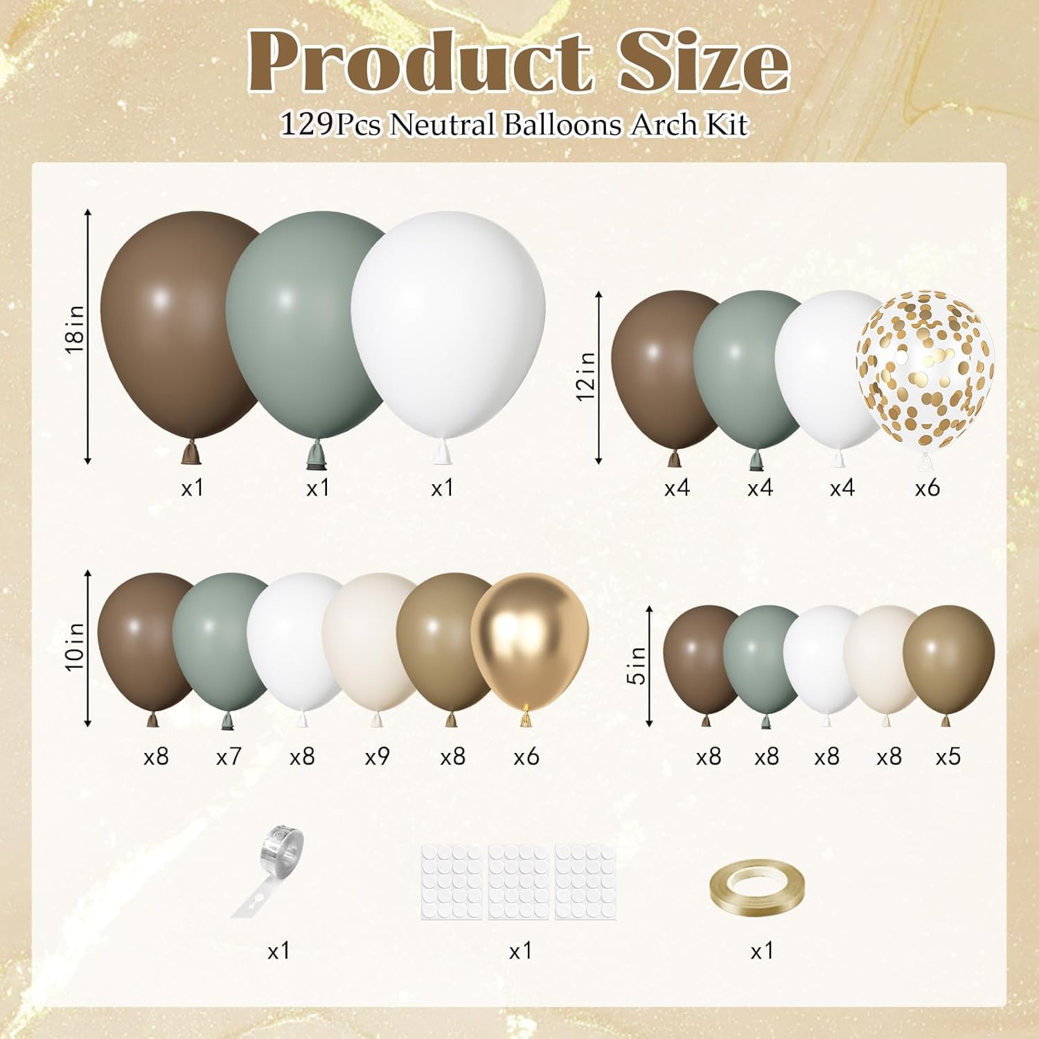 Dusty Green Nude Balloon Arch Kit: Includes 3pcs 18in balloons(dusty green/brown/white), 18pcs 12in latex/confetti balloons(dusty green/brown/white), 83pcs 10/5in balloons(nude/dusty green/brown/sand white/white/champagne gold), 5pcs balloon tools