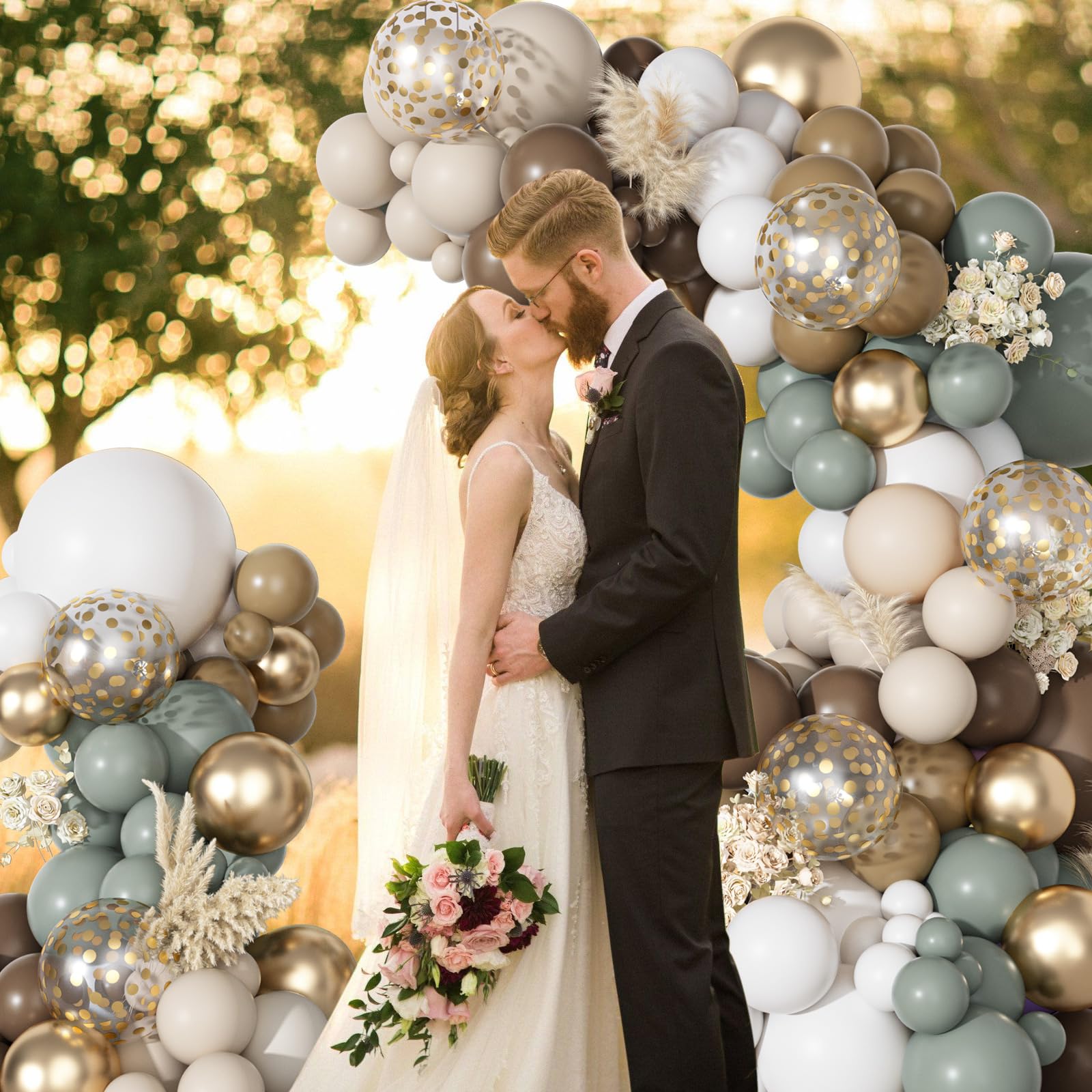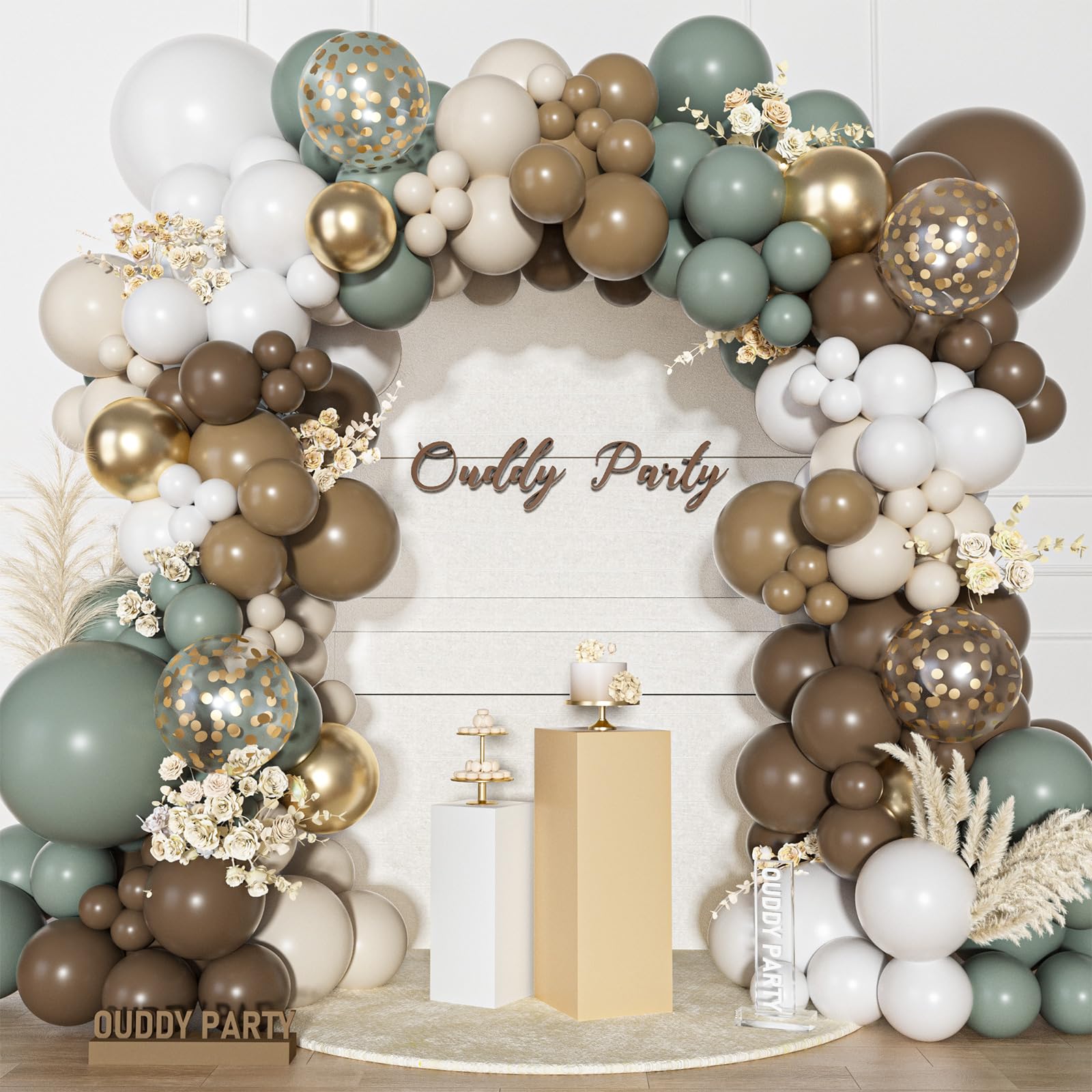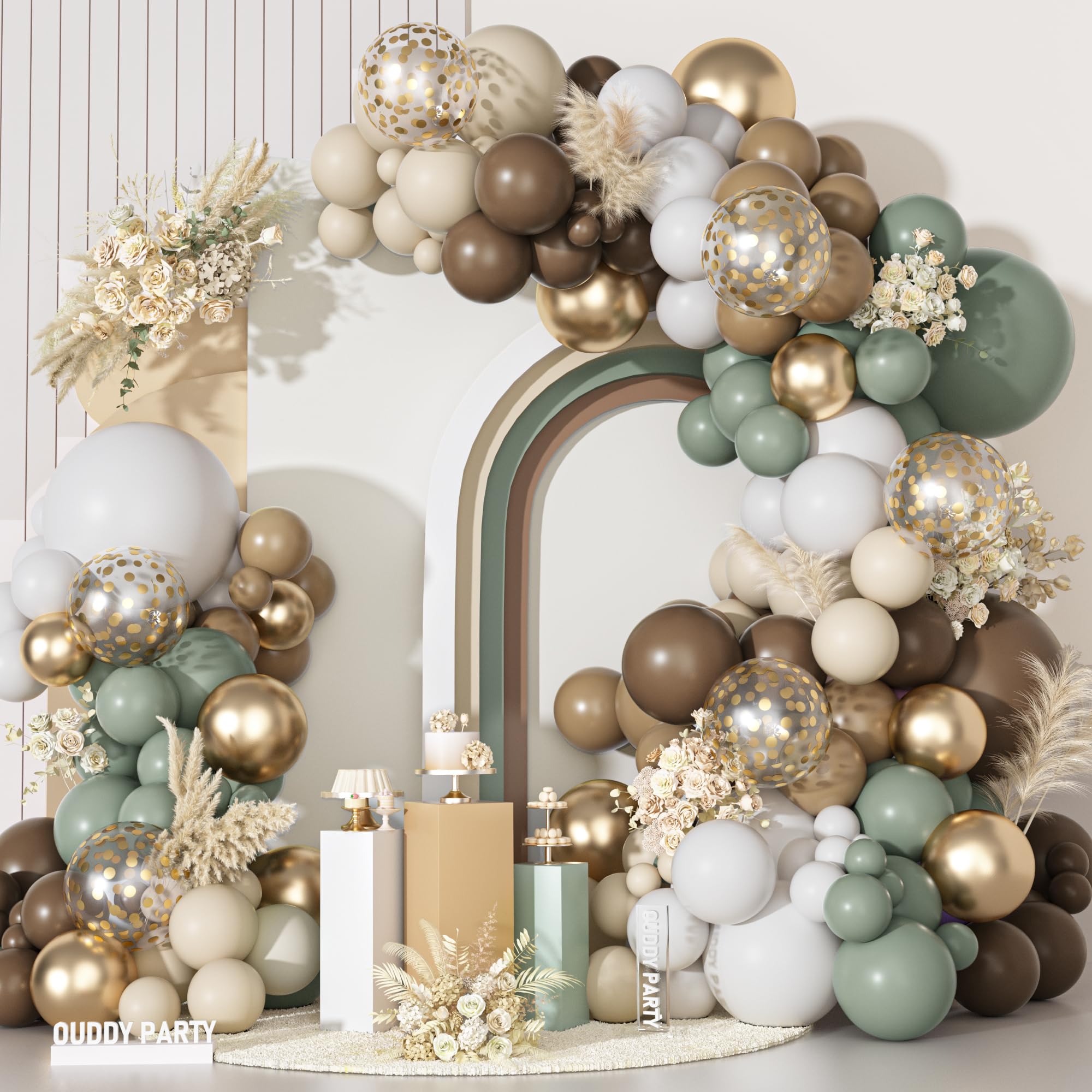 Dusty Green Nude Balloon Arch Kit: Includes 3pcs 18in balloons(dusty green/brown/white), 18pcs 12in latex/confetti balloons(dusty green/brown/white), 83pcs 10/5in balloons(nude/dusty green/brown/sand white/white/champagne gold), 5pcs balloon tools