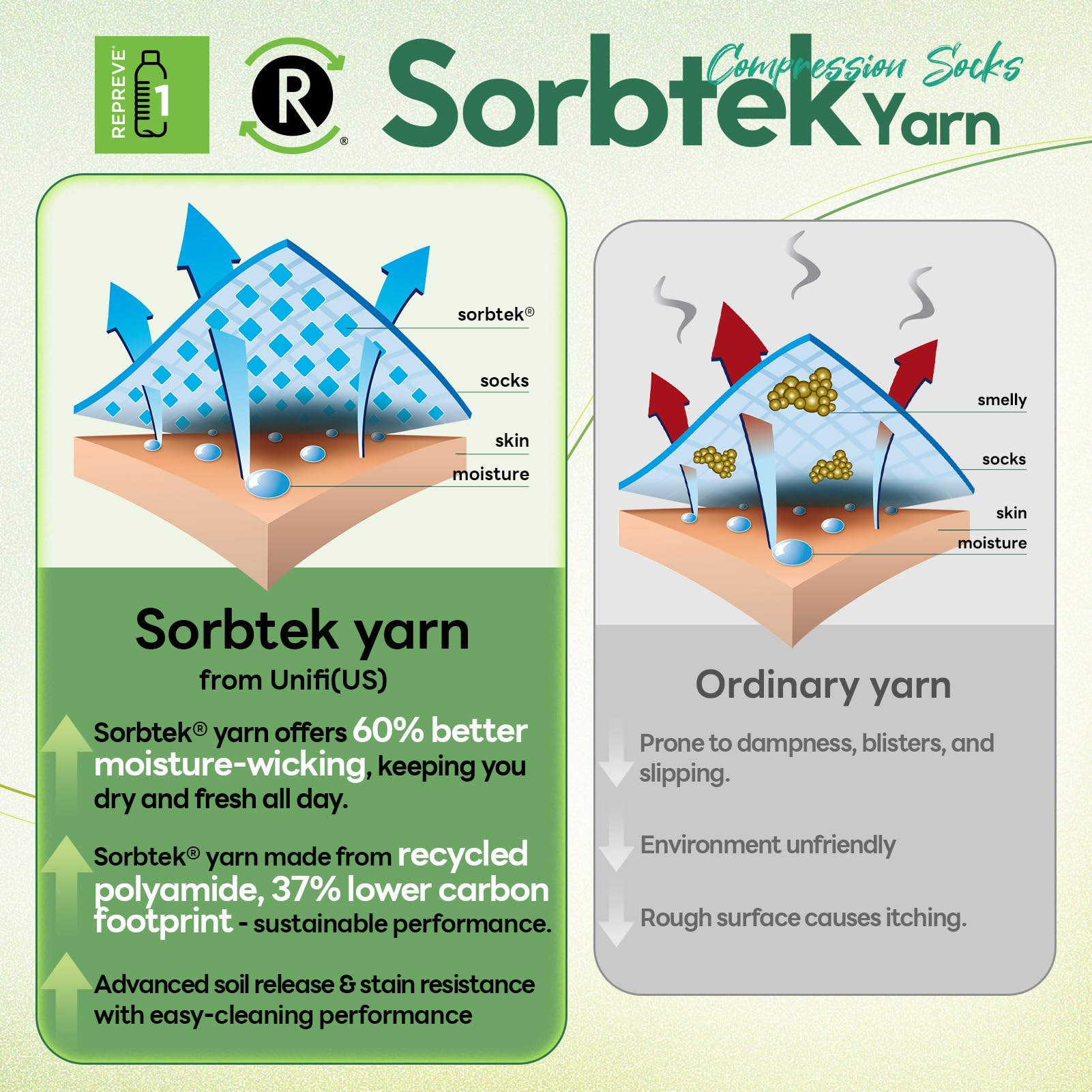 Sorbtek Repreve Polyester:Combining Repreve Sorbtek high-performance yarn with precision-balanced Lycra spandex, these socks feature innovative grooved-fiber technology for siphon-effect moisture management, delivering rapid drying, unmatched breathability, and fatigue-resistant stretch—engineered for effortless wearability and adaptive support across daily activities.