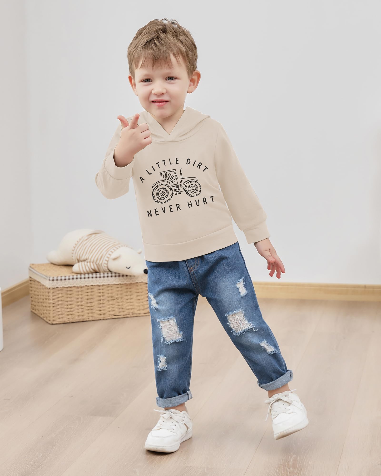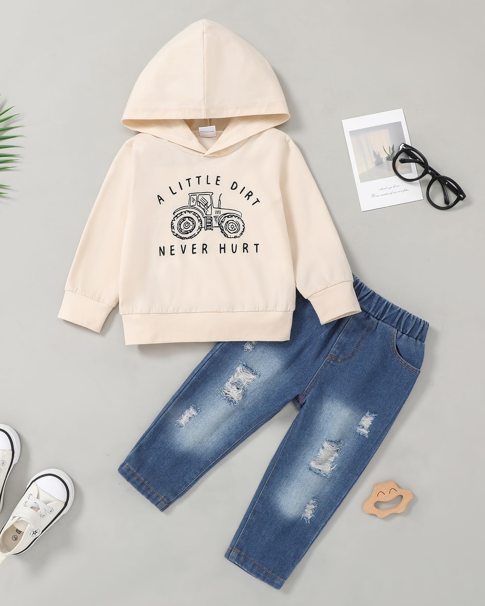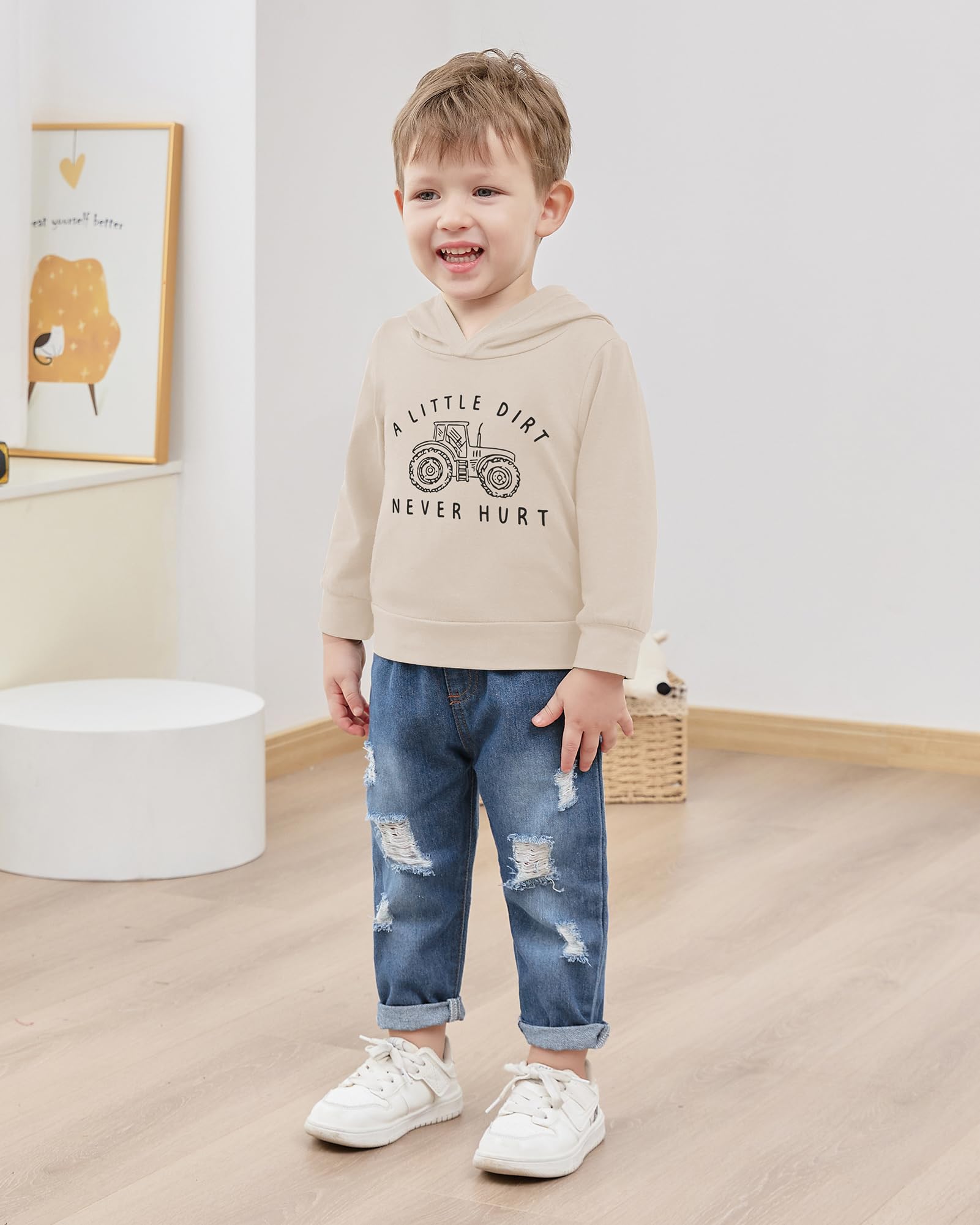 Stylish toddler fall outfits: Pullover design, letter pattern printed long sleeve hoodie top, and ripped jeans pants. Build your little guy a trendy look now!