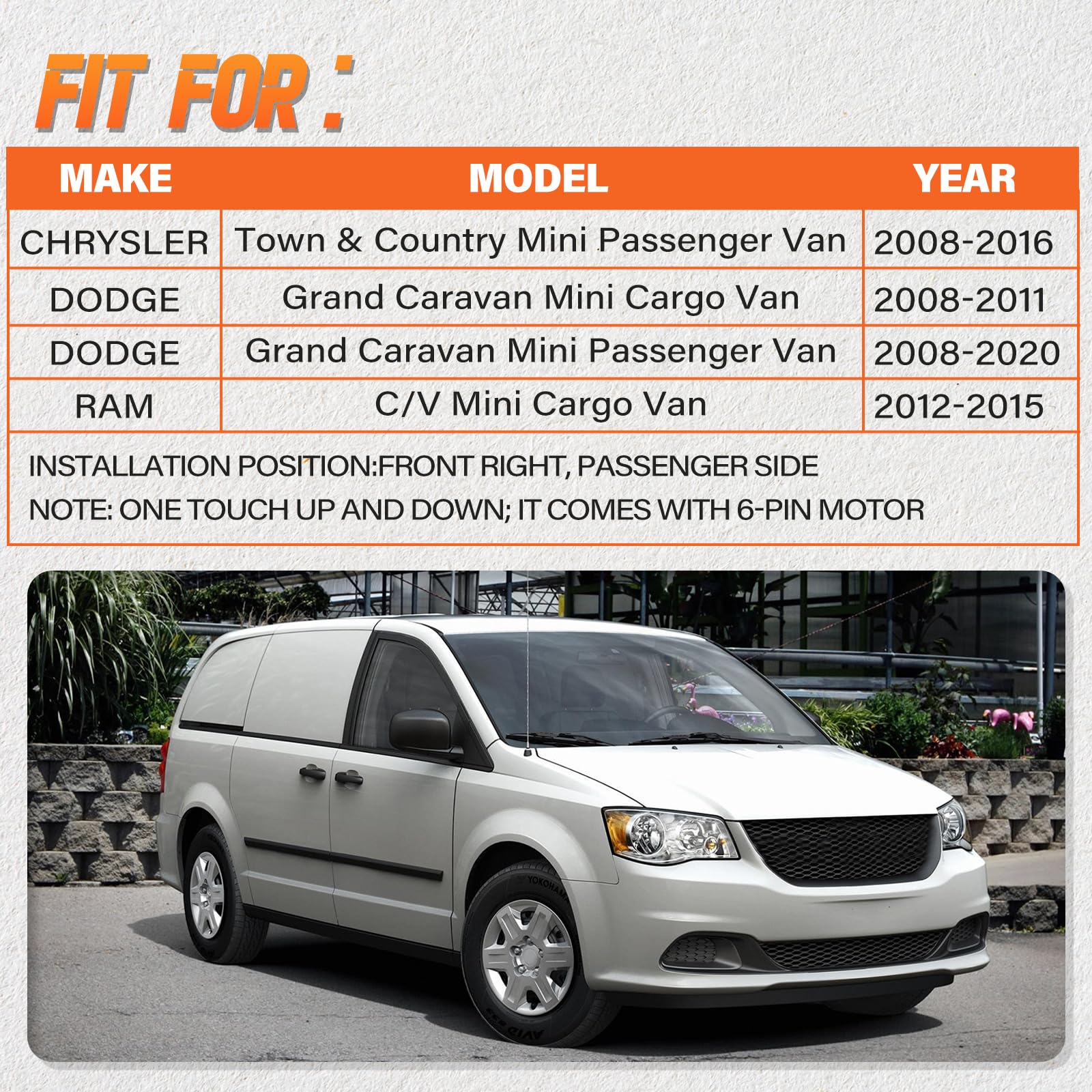 【Vehicle Fitment】Compatible with Dodge Grand Caravan 2008-2011 Mini Cargo Van, Grand Caravan 2008-2020 Mini Passenger Van; Compatible with Compatible with Chrysler Town & Country 2008-2016 Mini Passenger Van, Ram C/V 2012-2015 Mini Cargo Van---Front Right, Passenger Side