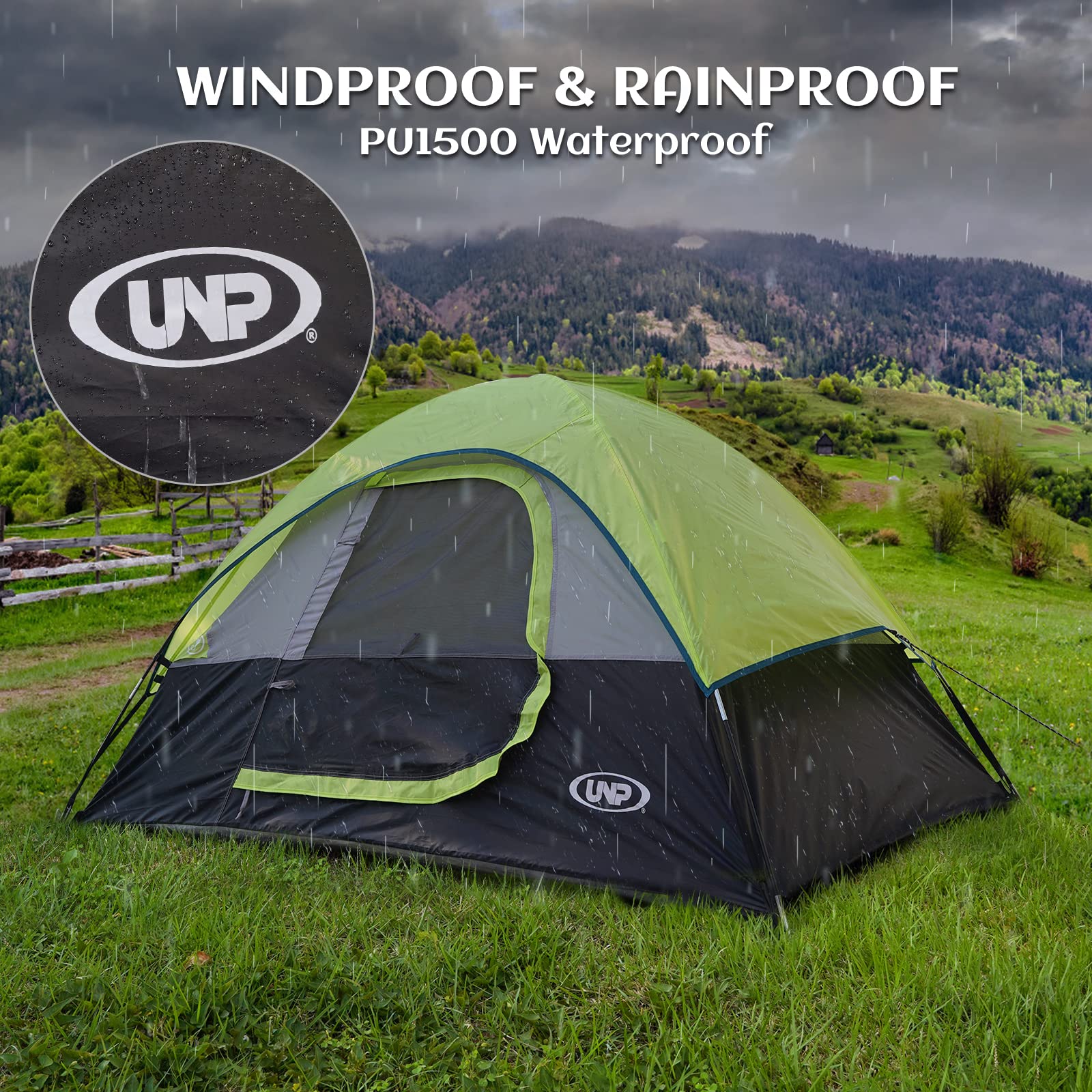 Windproof & Rainproof :The camping tent is made of stronger tear-resistant polyester.It come with a removable rainfly and two zippers designed for keeping the rain outside the tent. The ropes of tent and piles ensure safety and stability.