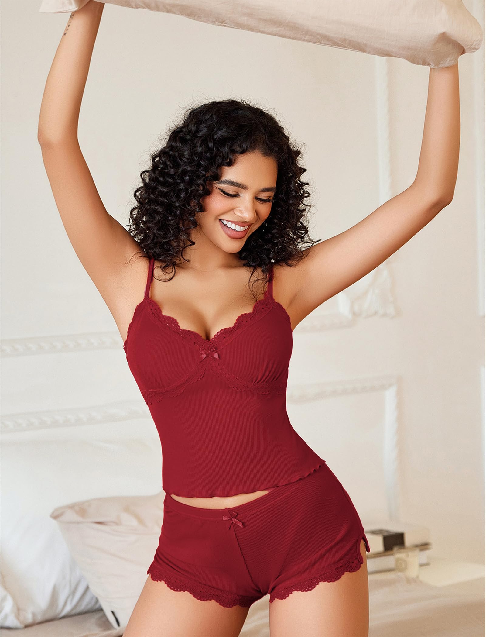 【Womens Pajamas Sexy】This womens sexy pajama sets is designed with sexy v neck & lace trim & adjustable spaghetti strap & side slit shorts with elastic waist,making you more charming and attractive