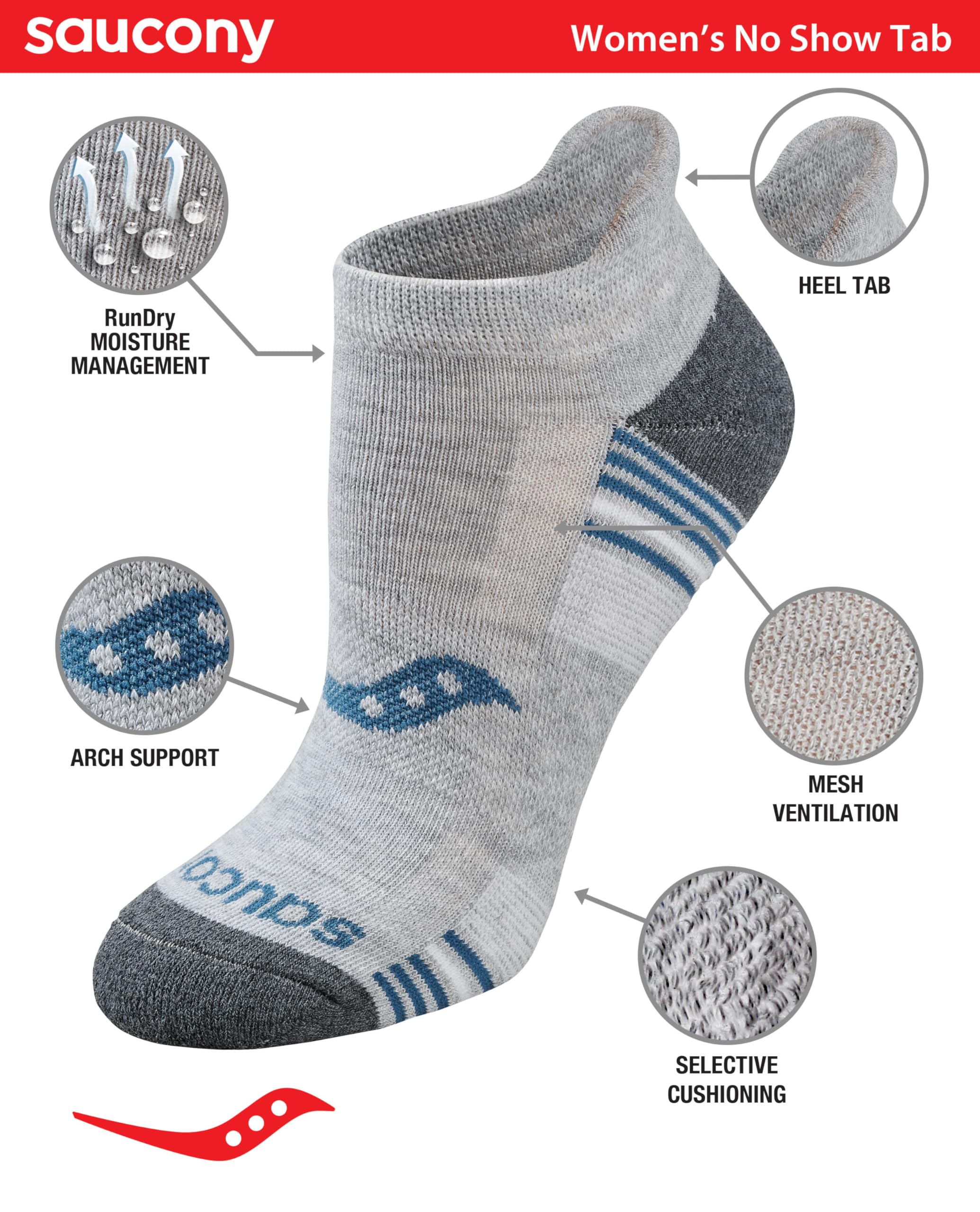 Description Saucony Women's Performance Heel Tab Athletic socks are a perfect combination of comfort and support. Great for the toughest training sessions. Features include heel tab design for added protection and comfort, RunDry moisture management to keep feet dry, arch support for an improved and secure fit, Mesh ventilation that enhances breathability and comfort, targeted zone cushioning in high impact areas for added comfort, and comfort toe seam for reduced irration.