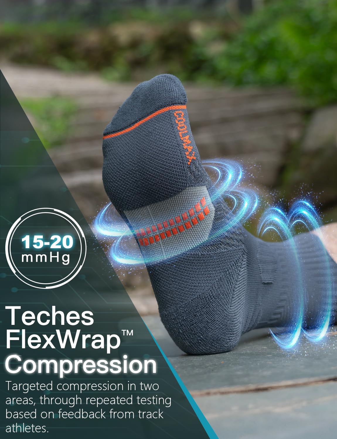 [Moisture-Wicking & Organic Bamboo Viscose Blend] – Keep your feet dry and fresh with our running socks! The COOLMAX fabric quickly wicks away sweat, while organic bamboo viscose helps minimize odors and keeps your socks feeling clean. Enjoy superior comfort and freshness with this innovative sock technology!