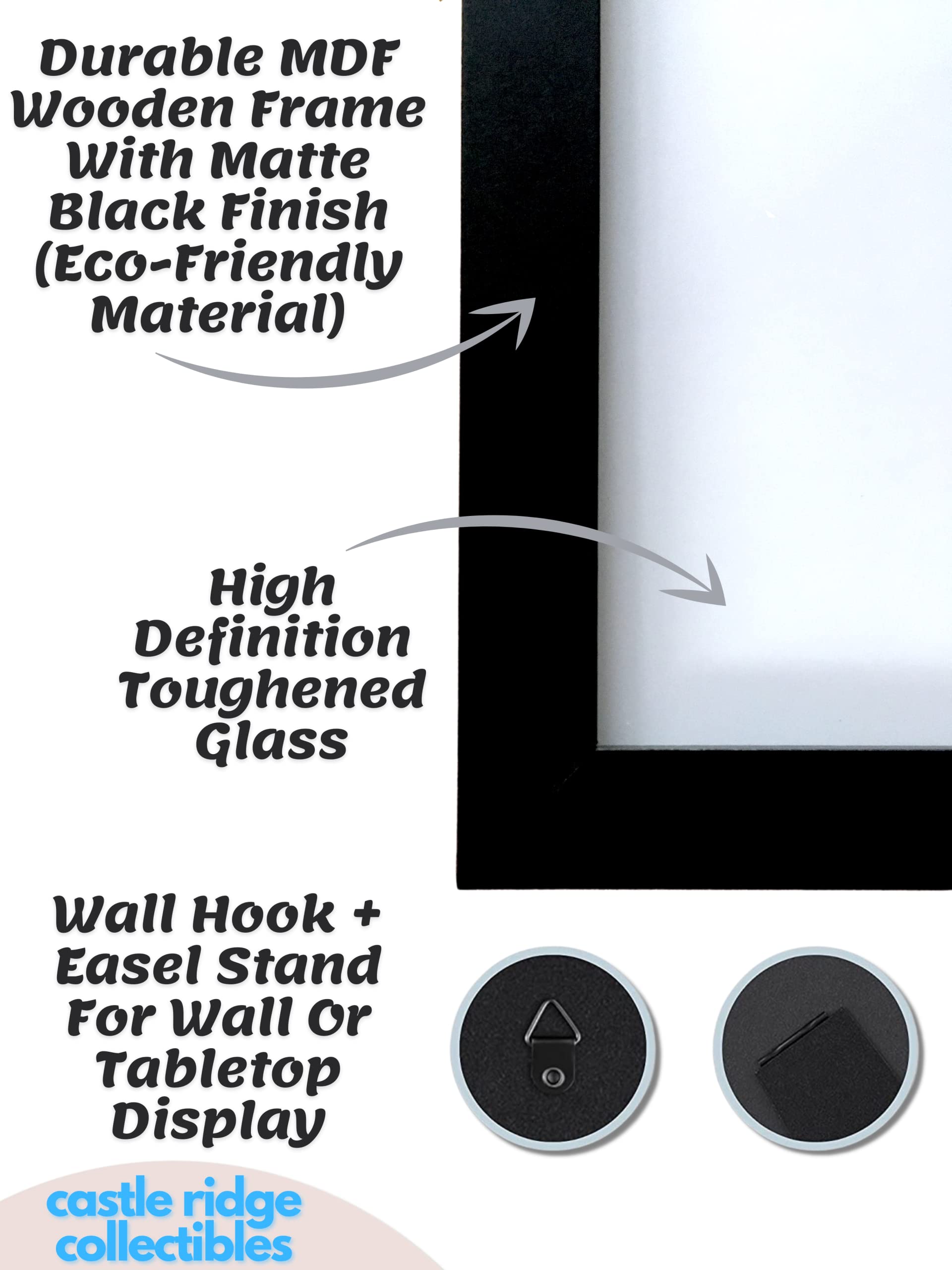 MATERIALS: Quality, durable, acid & lignin-free wooden frame setup with real glass panel protects against dust, scratches & moisture. Equipped with pre-mounted wall hook & easel stand for wall or tabletop display.