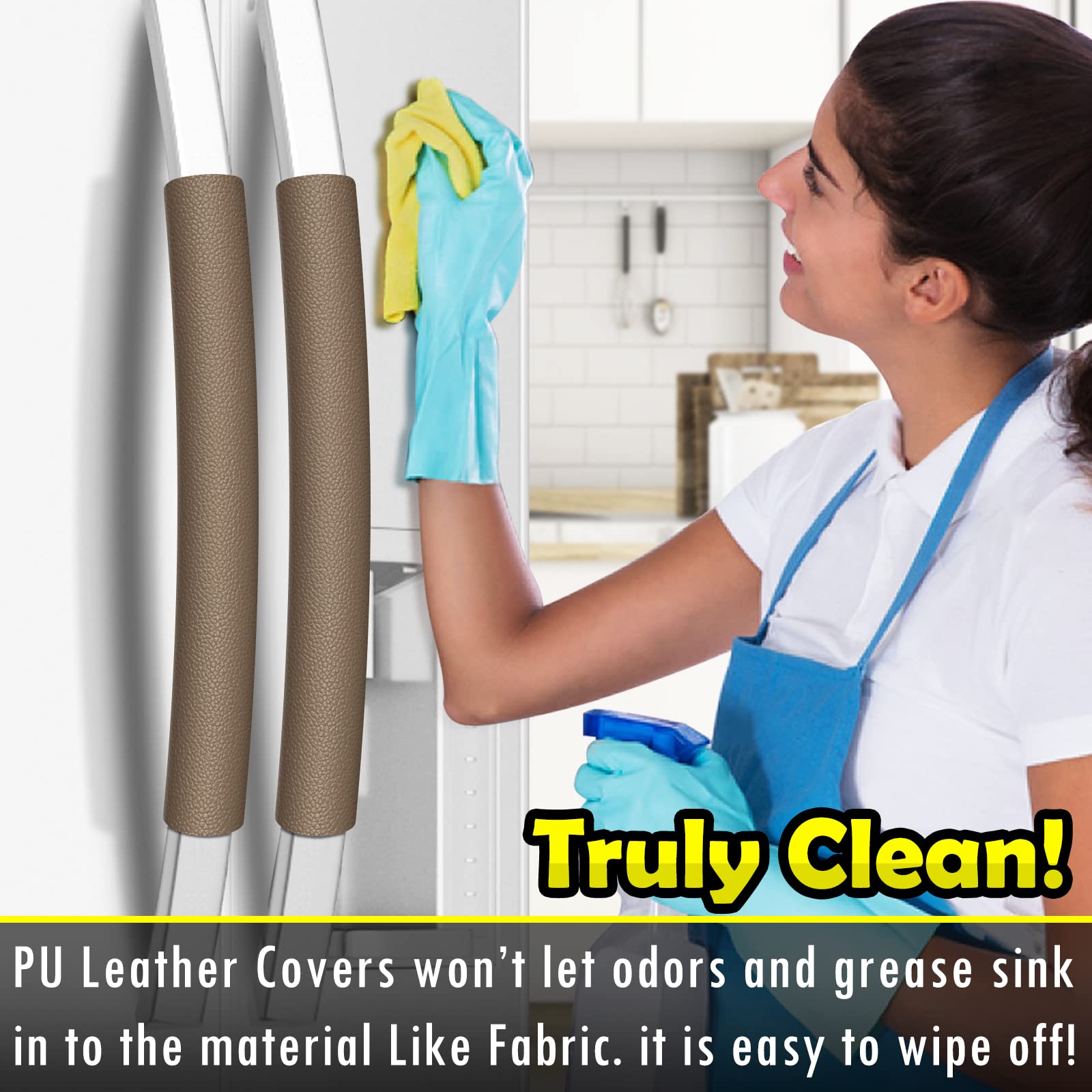 【Keep Truly Clean】Synthetic leather is the perfect material for handle covers! Kitchen handle covers see lots of dirty hands that can leave all kinds of stuff on them after you open and close your appliances. Our leather handle covers are non-absorbent and easily cleaned when they get dirty.