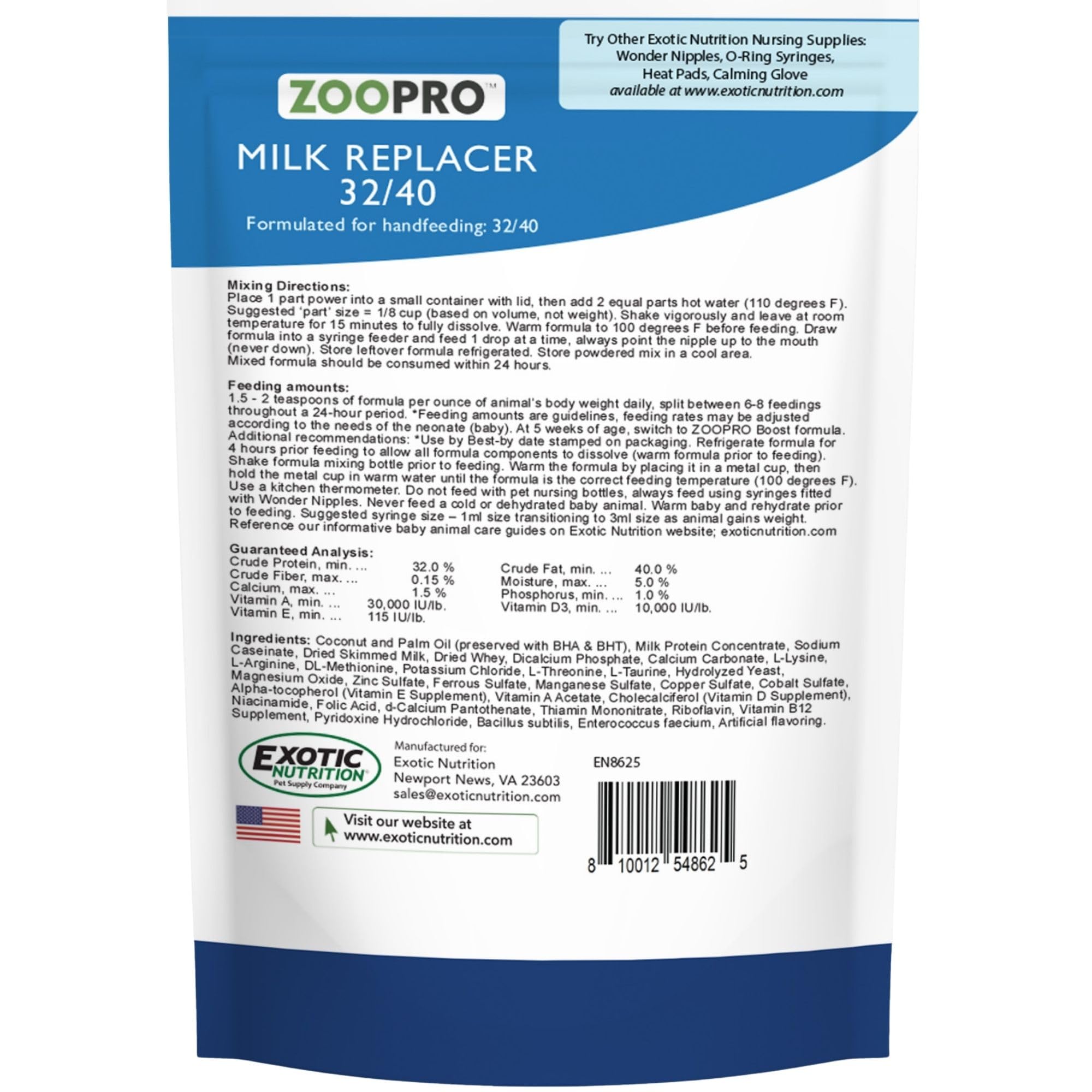 ✔ MILK REPLACER - The ZooPro Milk Replacer 32/40 is a powdered formula that mixes with water to form a complete food source for orphaned or rejected baby animals, as well as pregnant females.