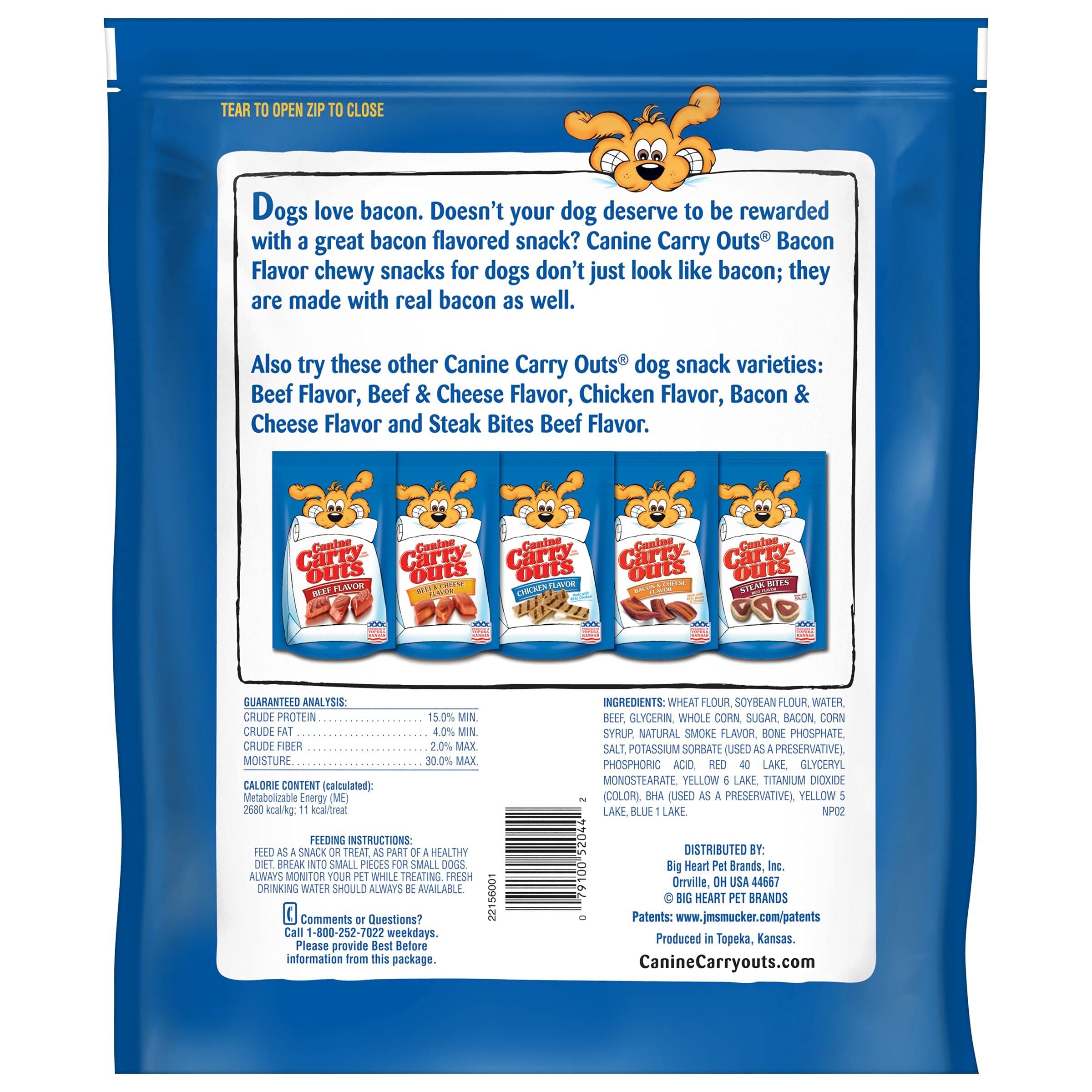 Contains four (4) 47-ounce bags of Canine Carry Outs Bacon Flavor dog treats