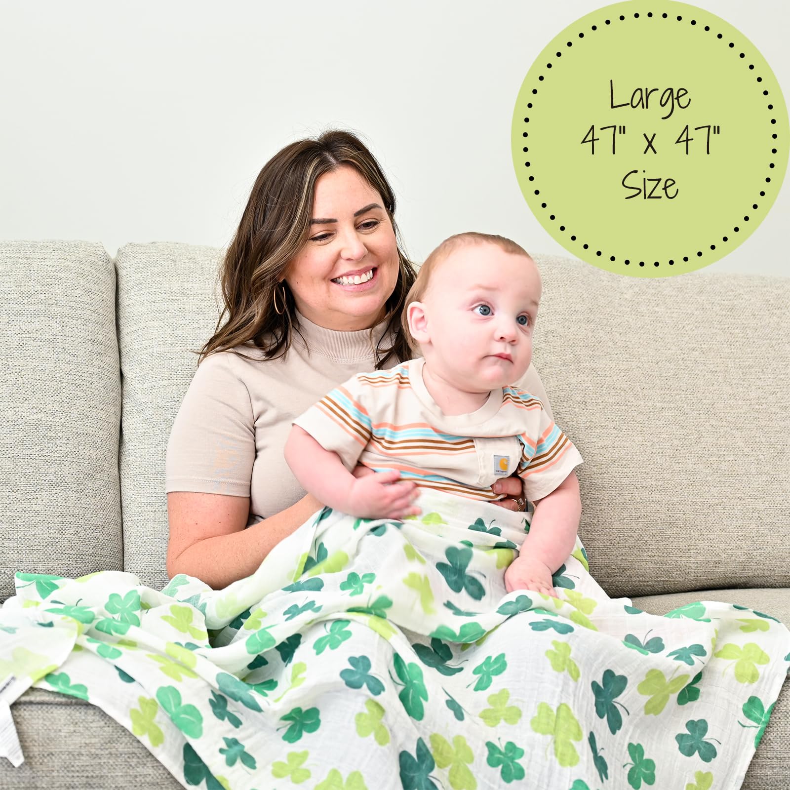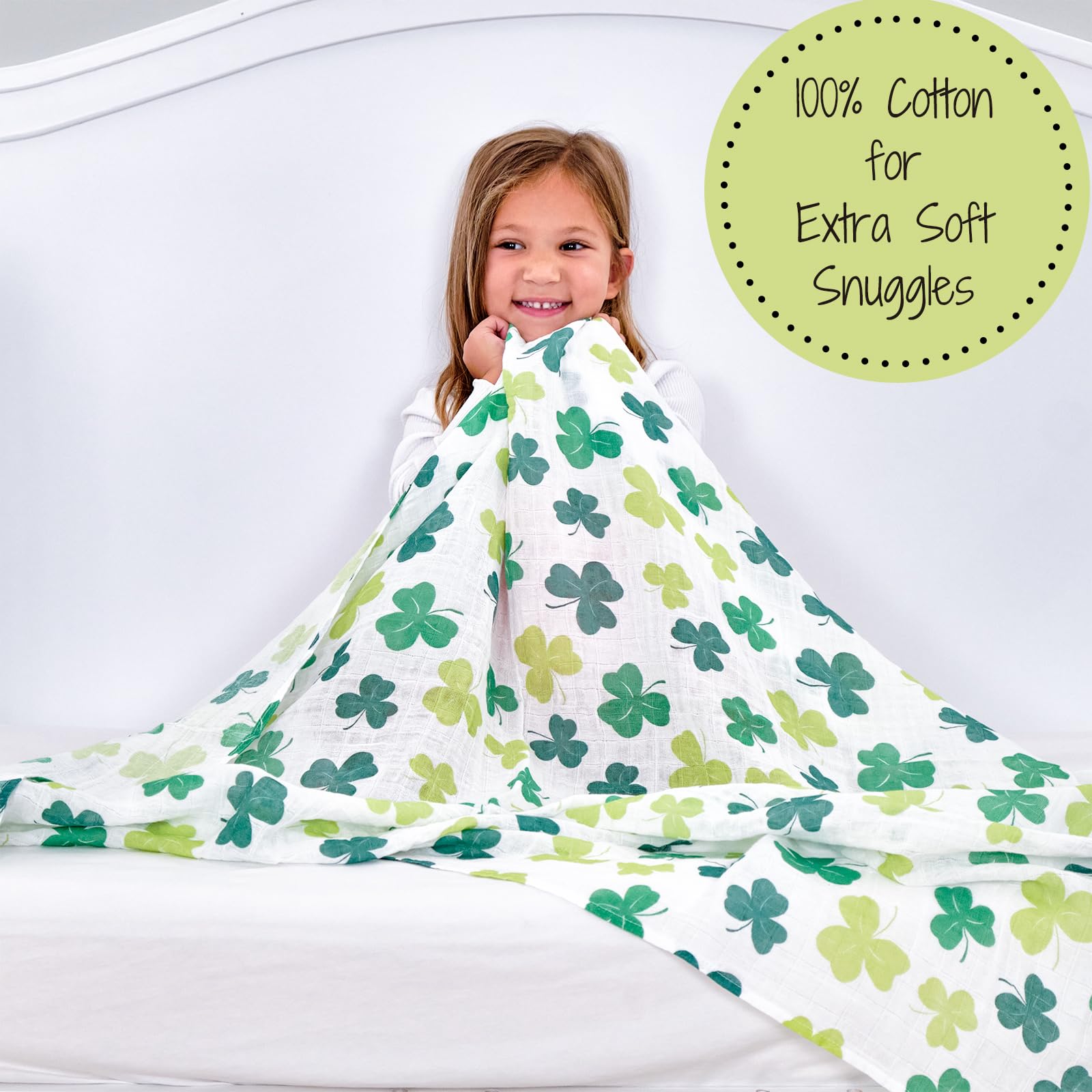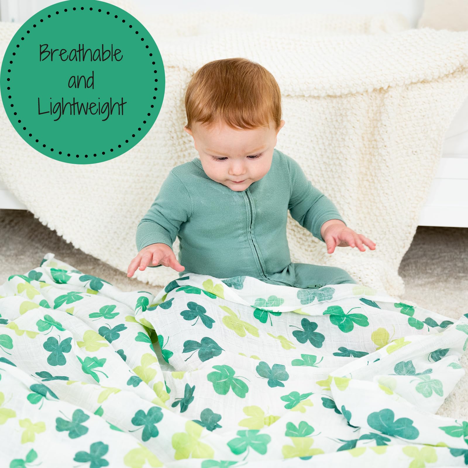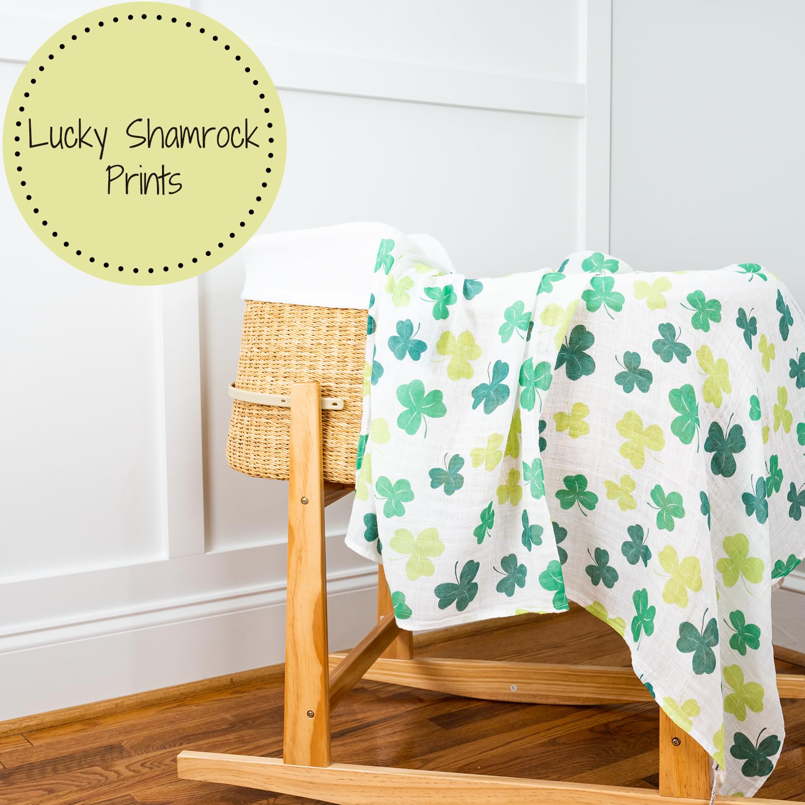 LUCKY SHAMROCKS - Surround your baby with good fortune in our muslin swaddle blanket adorned with shamrocks. Cozy yet airy, this design brings a touch of Irish luck to your little one’s day.