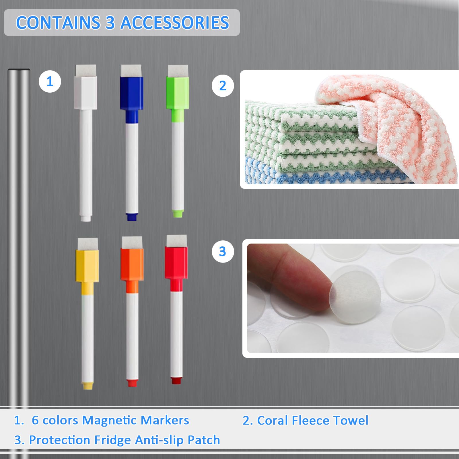 [ Dry Erase Calendar] This fridge calendar size is 10‘’ x 14’’.Magnetic acrylic dry erase board with 6 colors markers and clean towel, protection fridge anti-slip patch.