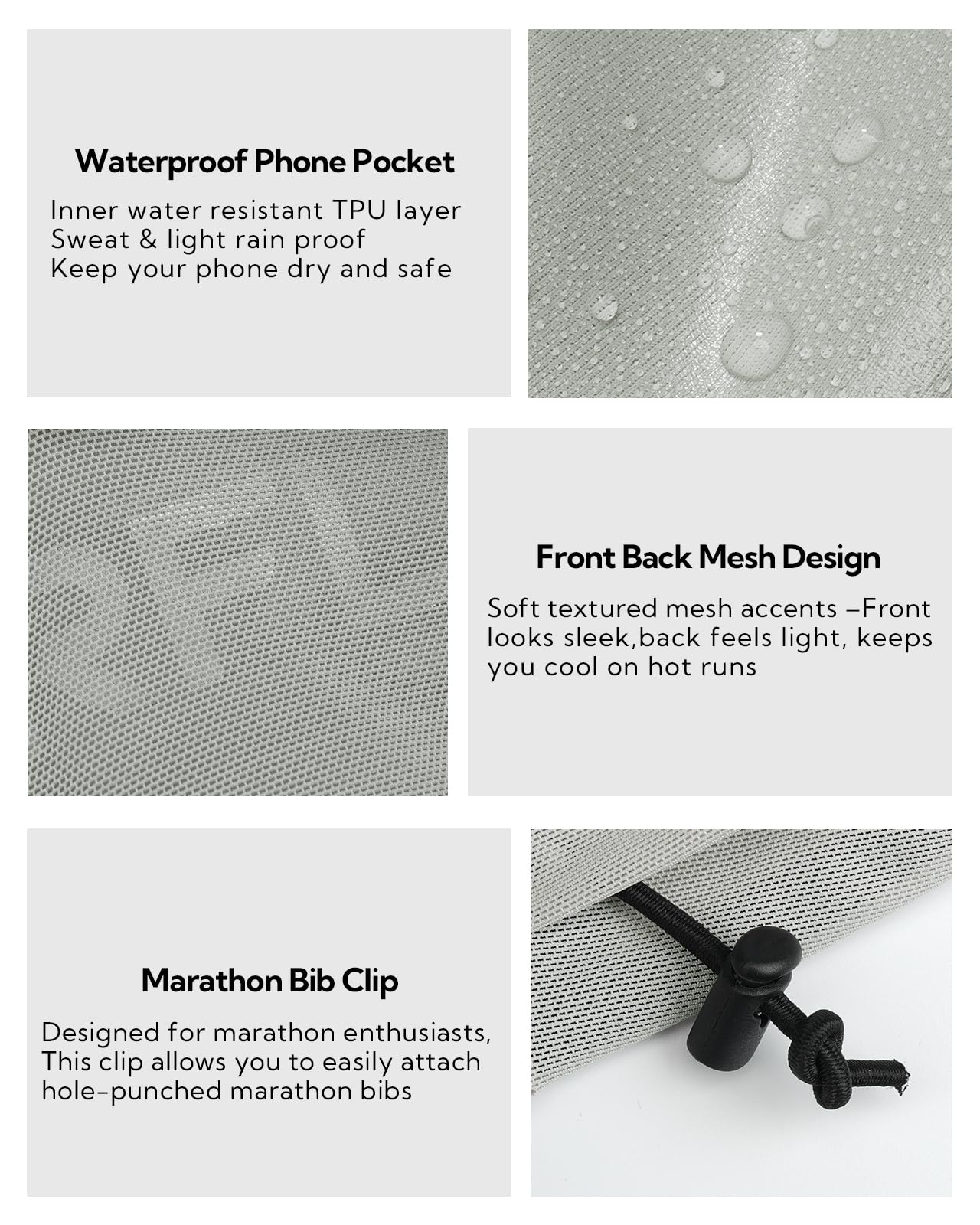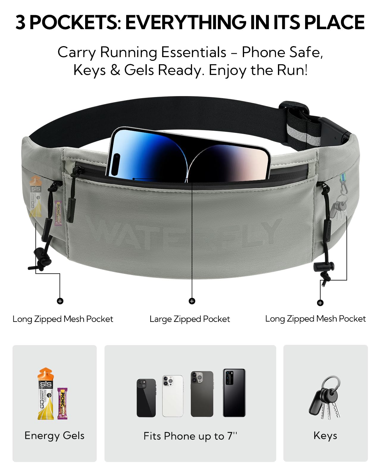 Multiple Pockets for Easy Organization: With 3 pockets, this running bag helps you store items orderly. Water resistant phone pocket fits phones up to 7". Two side zippered mesh pockets securely hold earphones, energy gels, tissues, and keys. Never lose your essentials again!