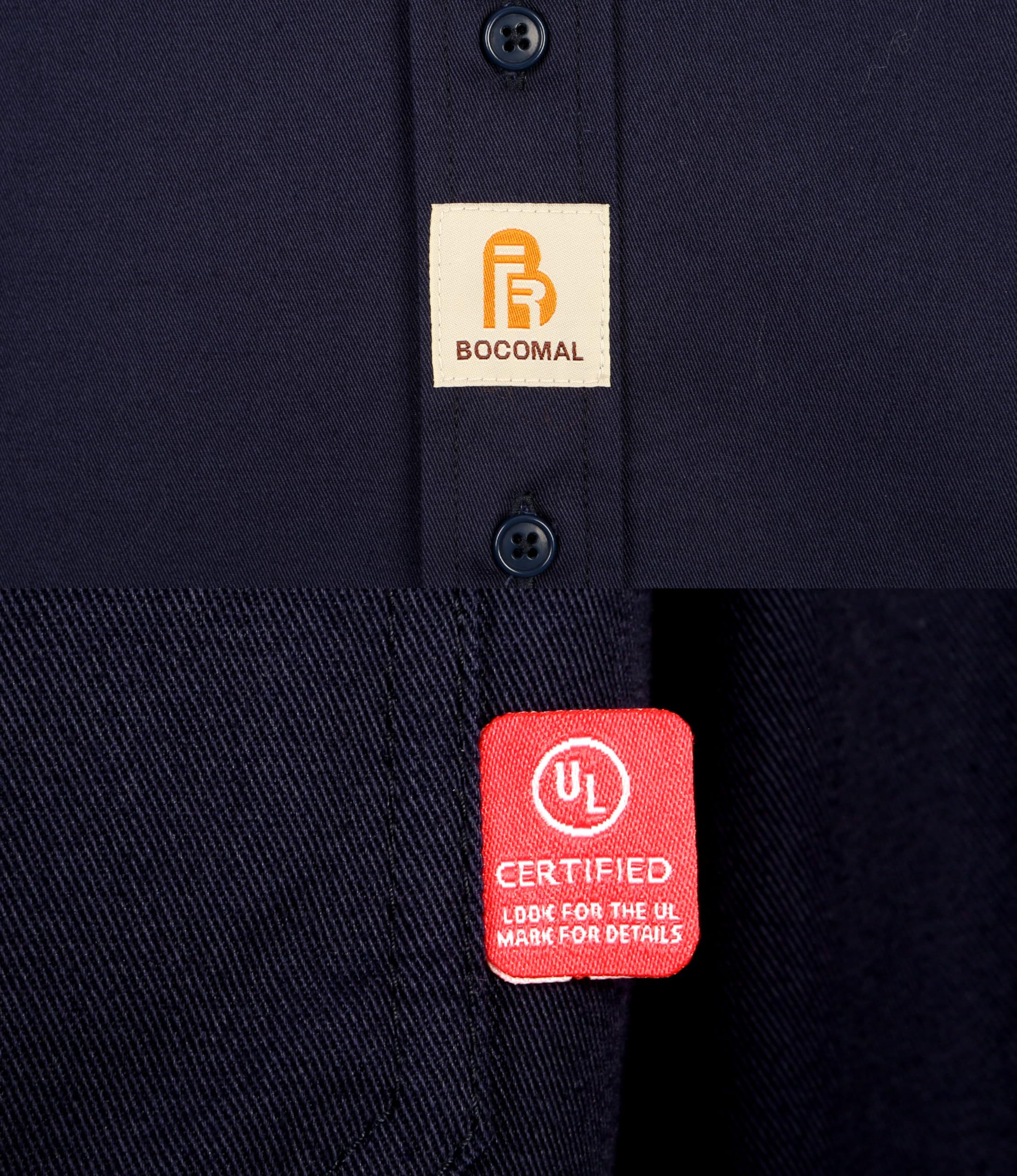 FR MATRIALS:7.5OZ Cotton Twill FR Treated,FR Buttons,FR Sewing Threads!Clear FR Tag on arms and bottom front.More FR info On Neck Tag About UL Certification.We Attached A Small Sample Inside Package For Cunstomers Simple FR Try