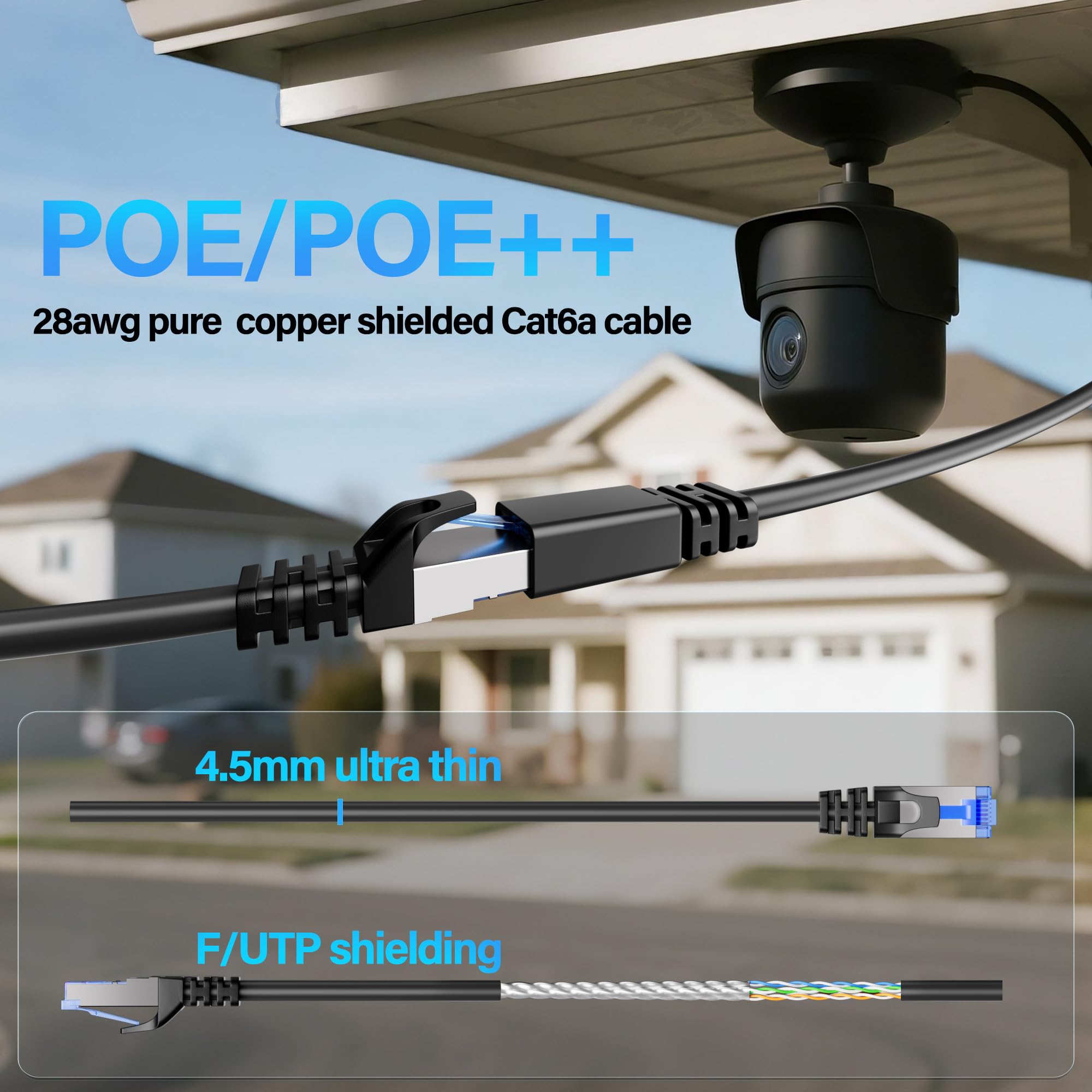 【Support POE】: Cat6a poe cable are made of 28awg pure bare copper, which has excellent conductivity and minimal signal loss. Cat 6 shielded ethernet cable support POE/POE++ for security cameras, VoIP phones, access points and so on. Pure copper wires of ethernet cable cat 6a ensure faster speeds, less resistance and reliable POE++ power supply.