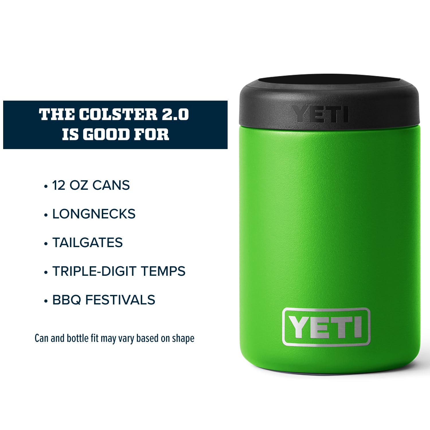 The YETI Standard Colster 2.0 is good for: Standard 12 oz. Cans, Longnecks, Tailgates, Triple-digit temps and BBQ festivals. Can and bottle fit may vary based on shape