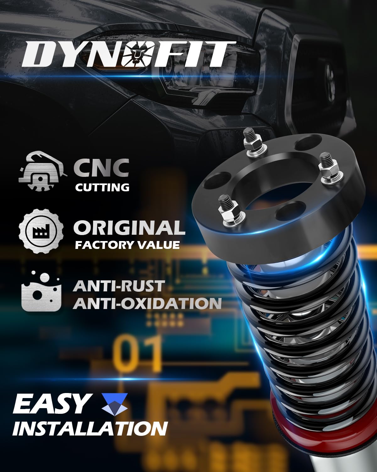 【Built for Safety and Durability】Dynofit leveling kits made of forged aircraft-grade aluminum billets, Grade 12.9 solid bolts, black andoized surface offers better corrosion resistance and a cool look