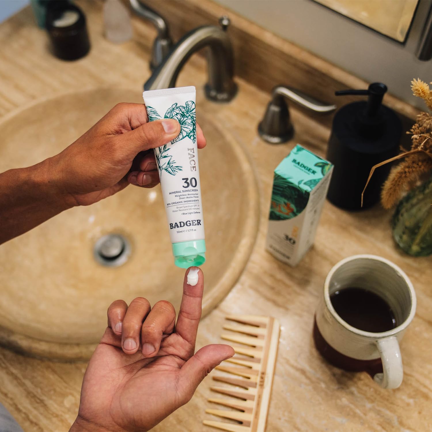 SUSTAINABLE FACE SUNBLOCK: Badger's face lotion with spf is 80% organic, cruelty free, GMO free, gluten free, in a 50% PCR tube & made with 100% solar power in the USA by a women-owned family business