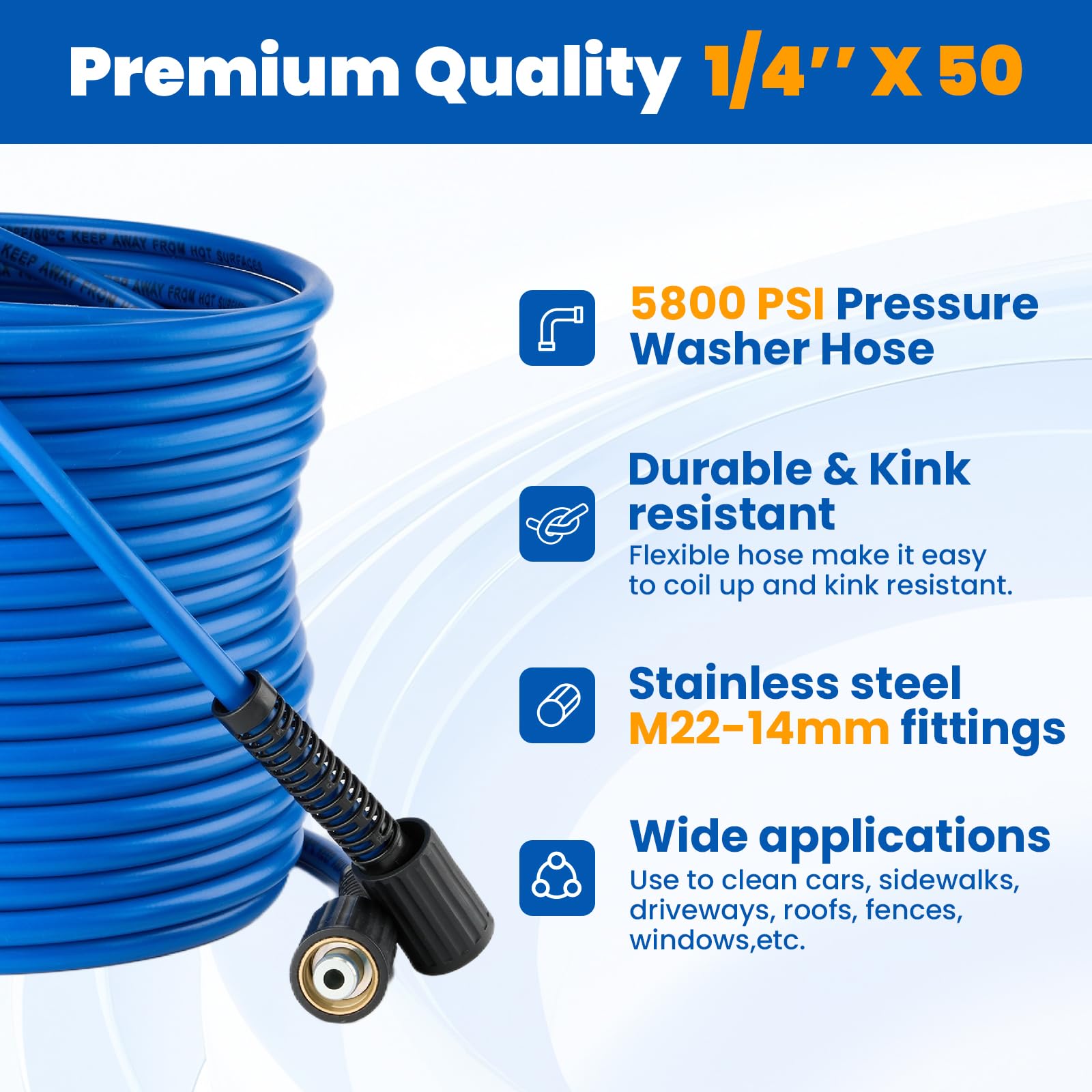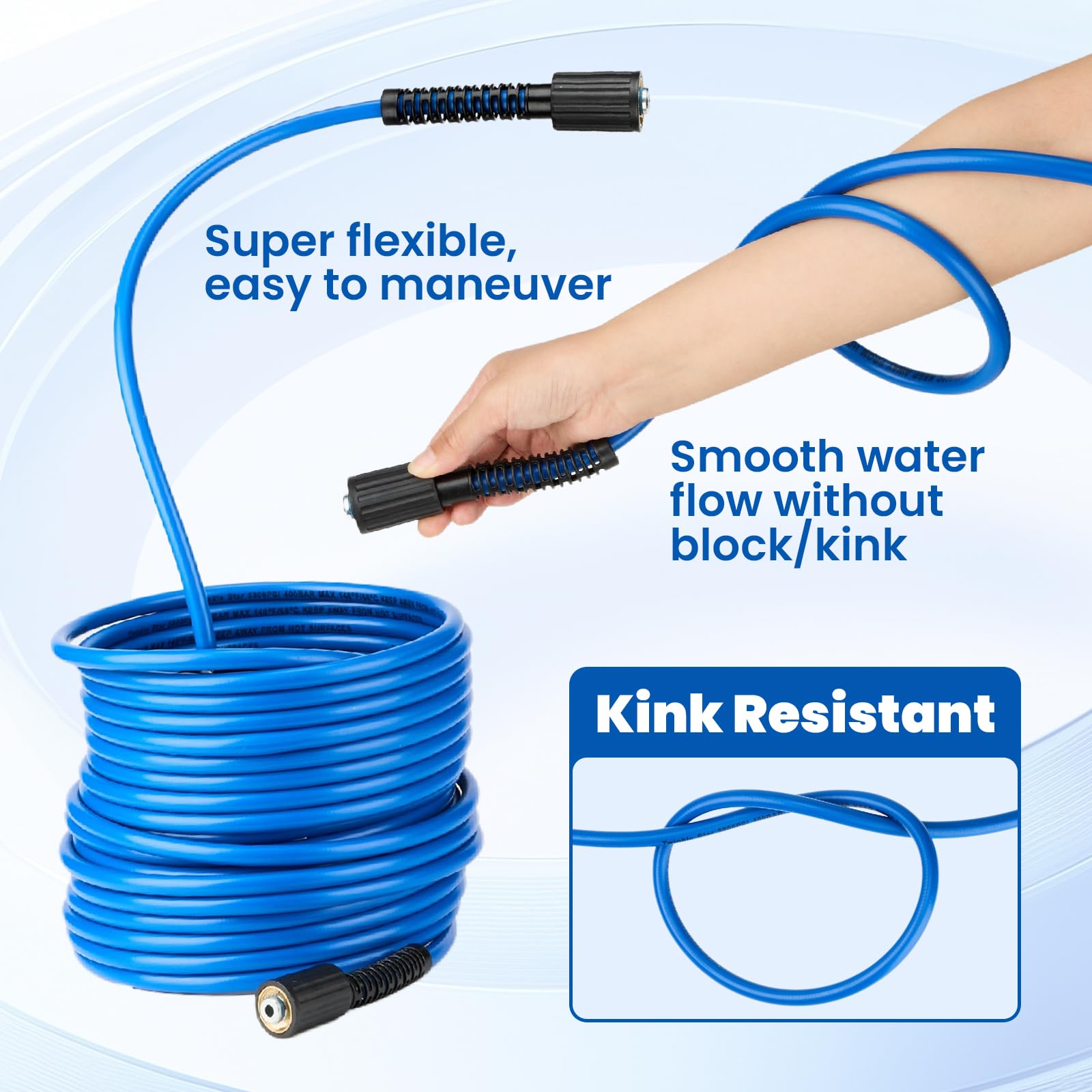 [Kink Resistant & Durable Plumbing Jetter Hose]: The 1/4" pressure washing hose won't kink under pressure, providing a longer lifetime and safe usage for your home or commercial use. It can be used to wash cars, motorcycles, floors, windows, driveways, roofs, pools, siding, and more.