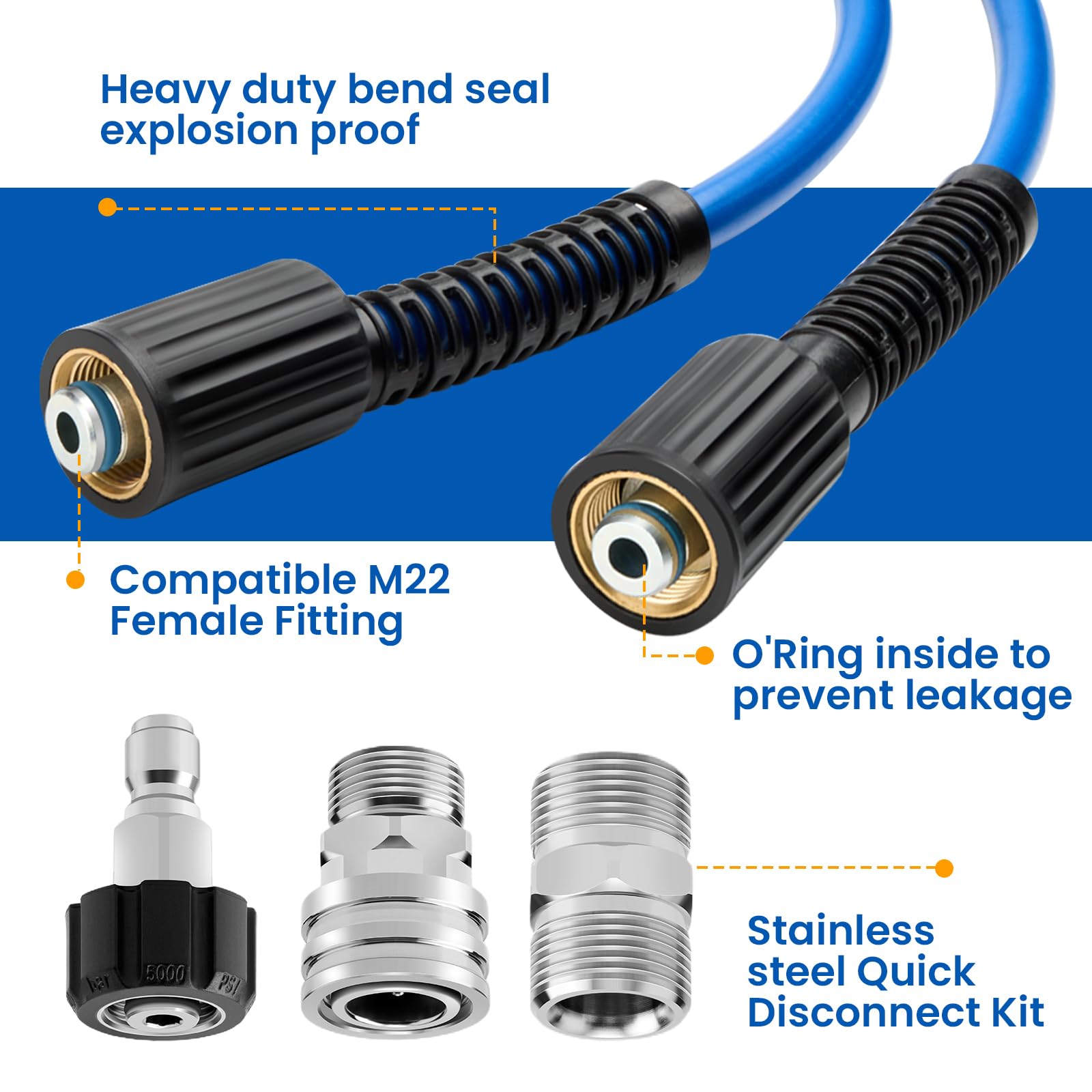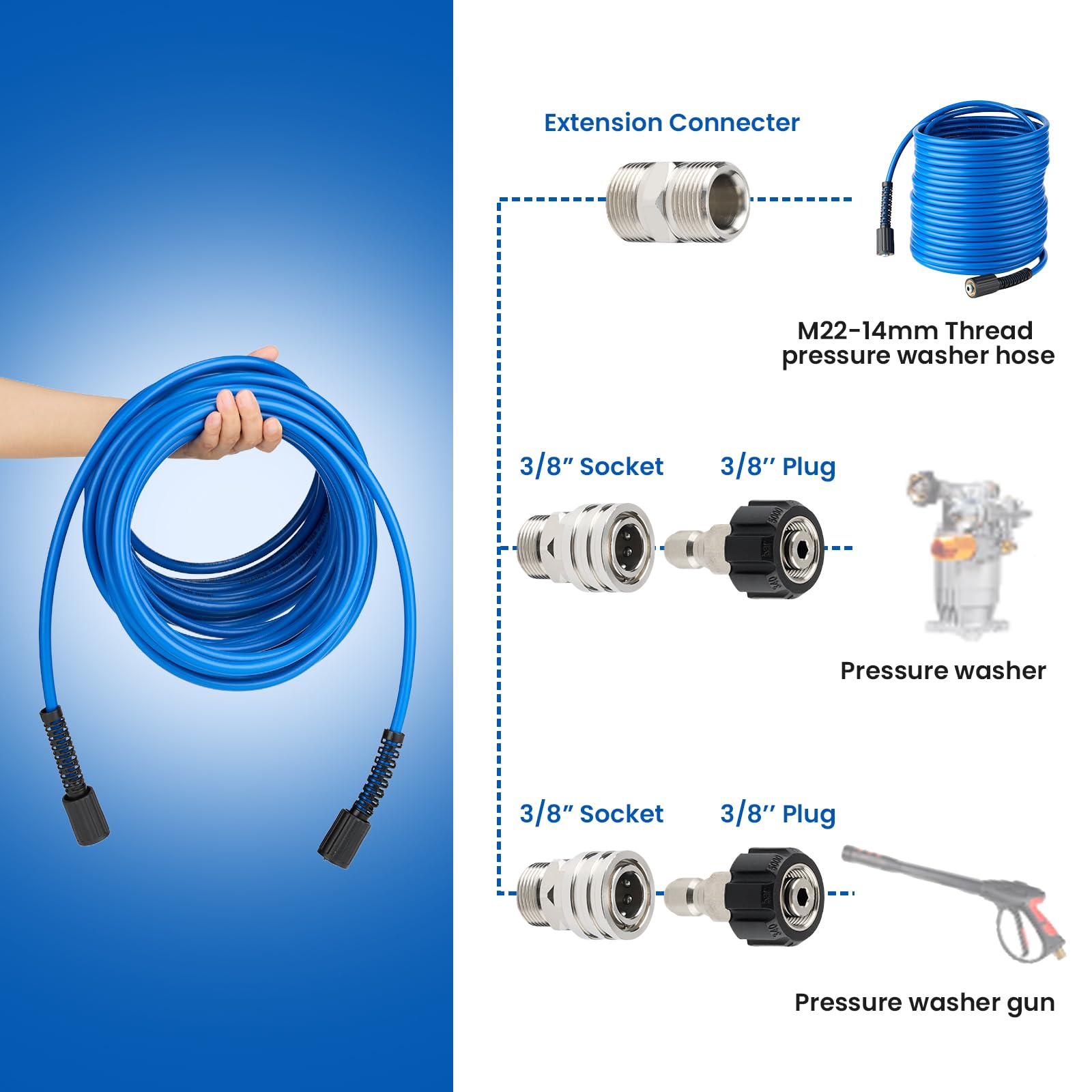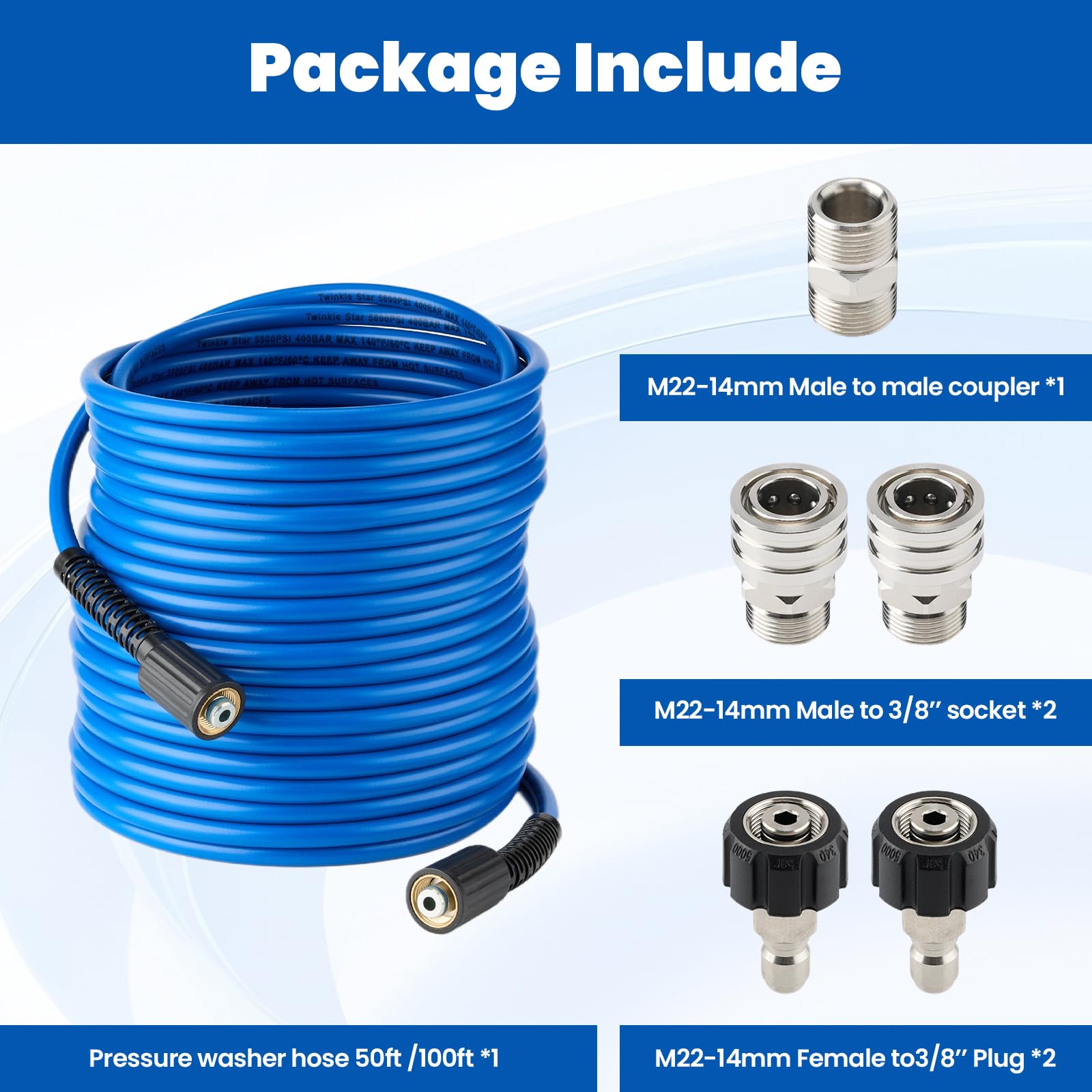 [Pressure Washer Sewer Jetter Kit]: High pressure wash hose kit includes a 50 inch high pressure wash hose, two M22-14mm threaded female to 3/8 inch quick connect plug fittings, two M22-14mm threaded male to 3/8 inch quick connect socket fittings, and one M22-14mm threaded male to M22-14mm threaded male fitting.