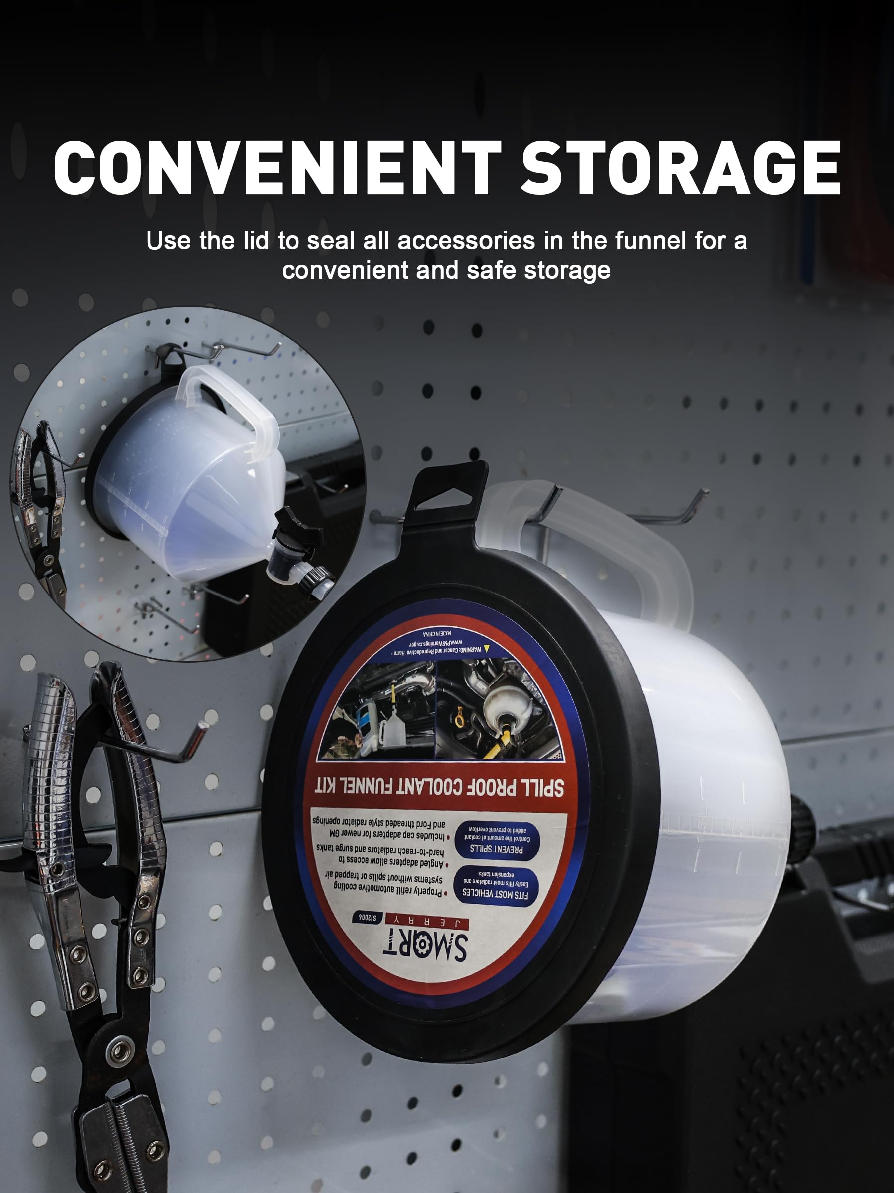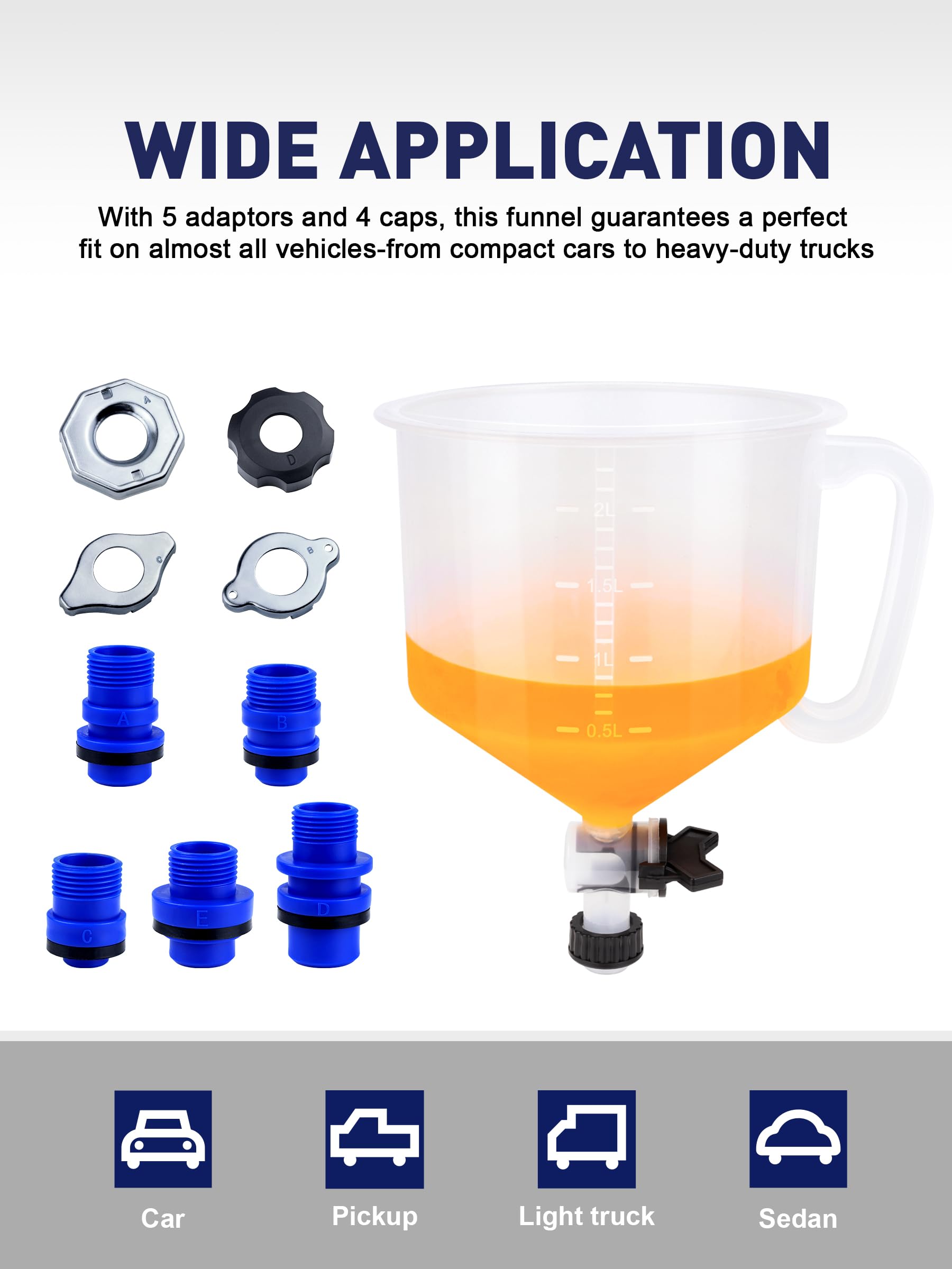 Smart Jerry special designed funnel with adaptor equipped with rubber gasket ensures no spill and no lekage during changing radiator coolant, flushing systems, vacuum filling, or replacing hoses, keeps vehicle cooling system and other engine parts clean
