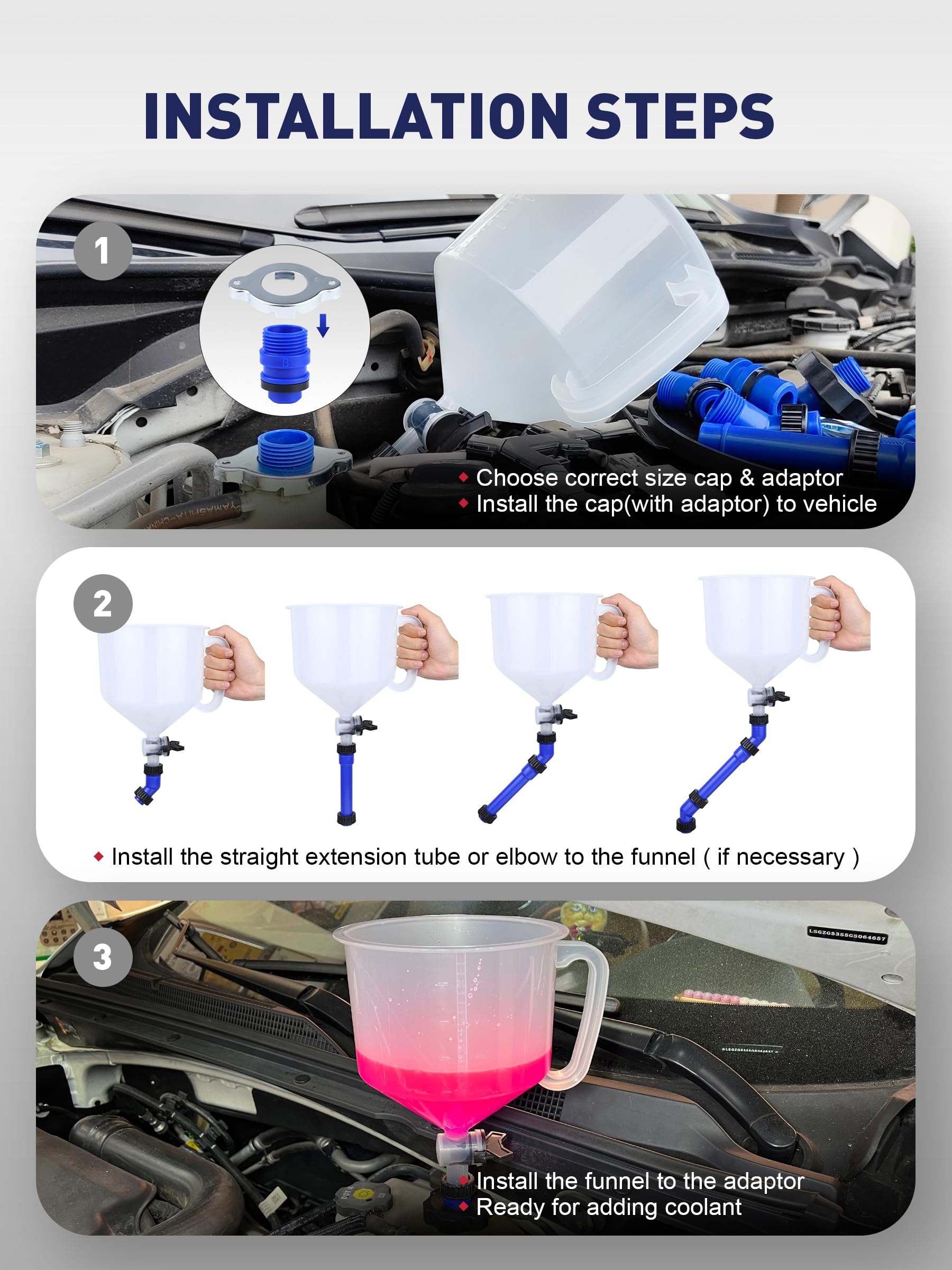 This antifreeze funnel kit comes with 5 adaptors and 4 caps, works on almost any domestic or imported vehciles; and comes with 2 pcs straight extension tubes & 2 pcs 45Β° elbows allow access to caps located under shrouds or in fender wells