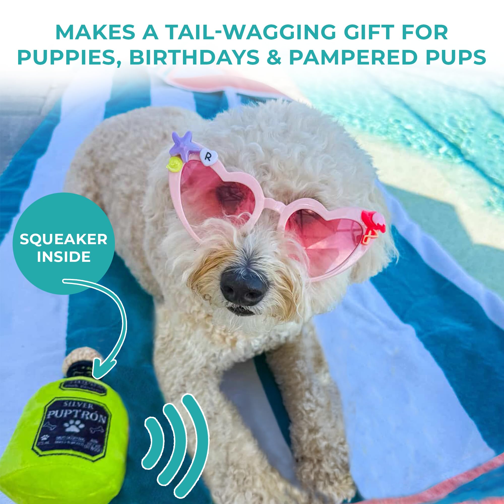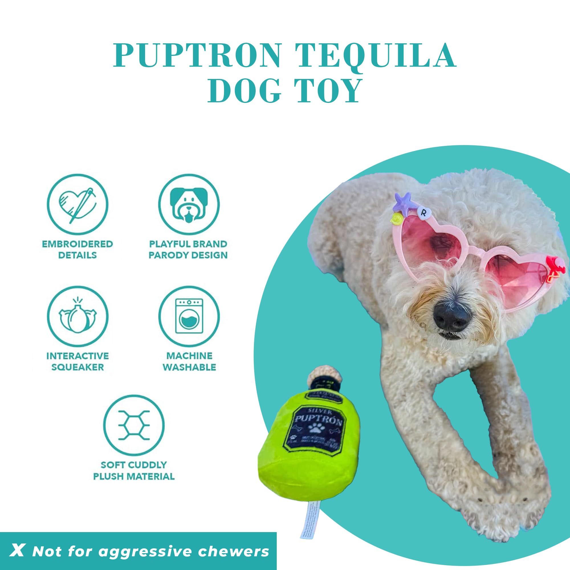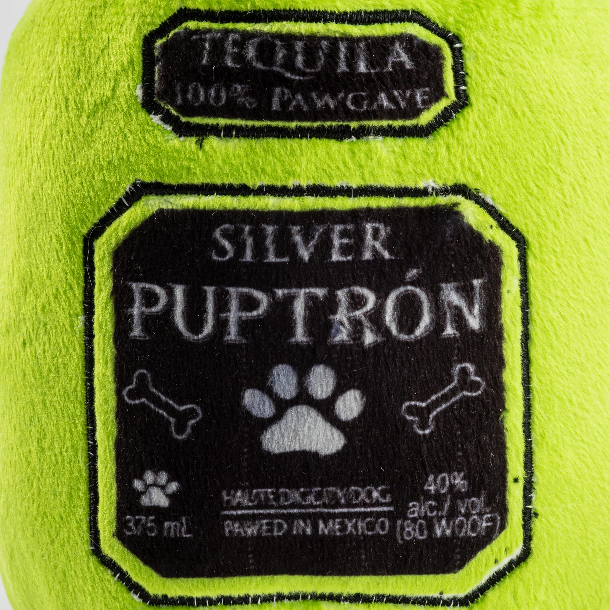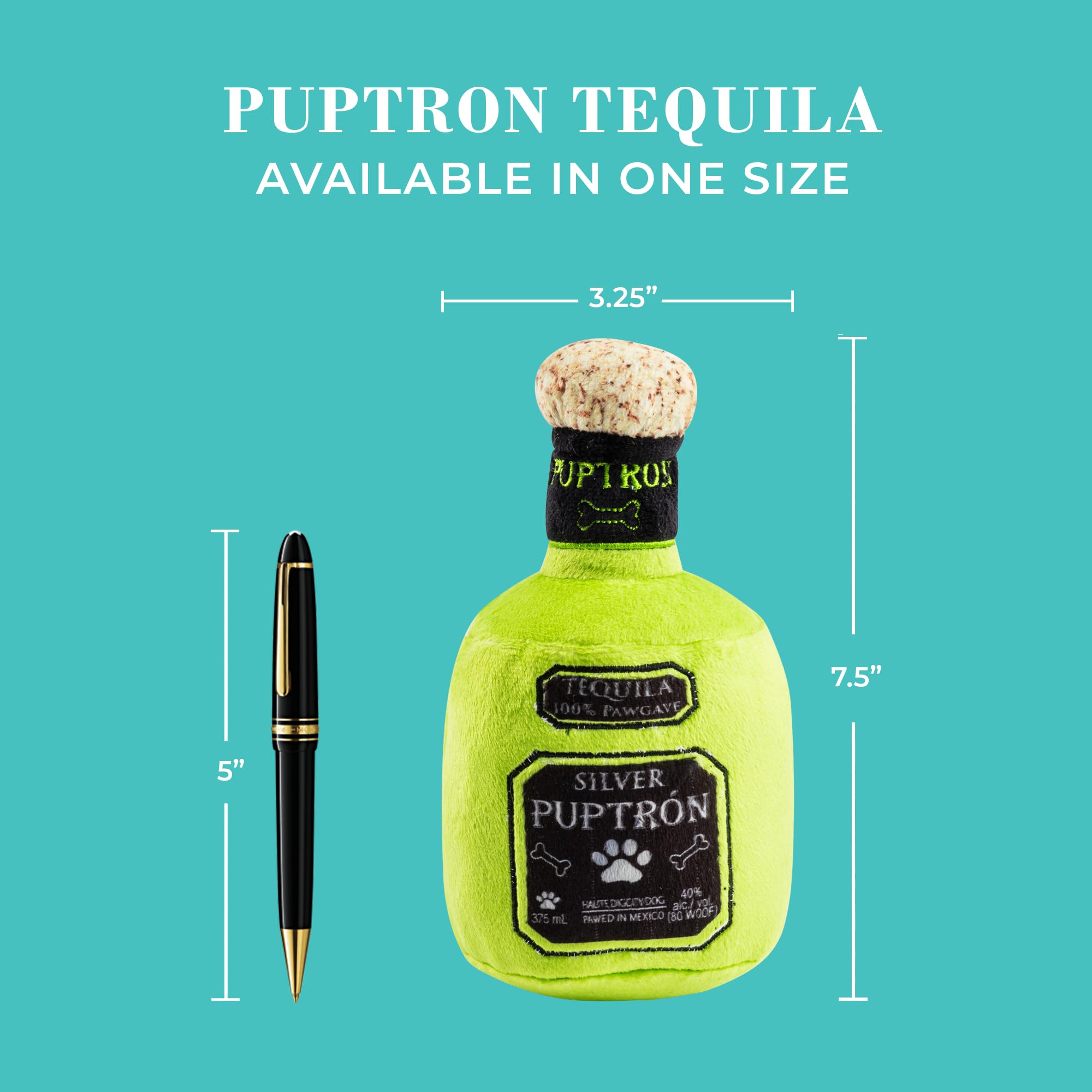 Funny Parody Plush Dog Toy: Upgrade your pup’s Muttini Bar with this top-shelf Puptron Tequila dog toy. This funny dog toy features a vibrant lime-green plush exterior bottle design with a built-in squeaker hidden inside. It’s a fun, cute interactive dog toy that turns every playtime into happy hour! One Size: 7.5"x4"x3.25"
