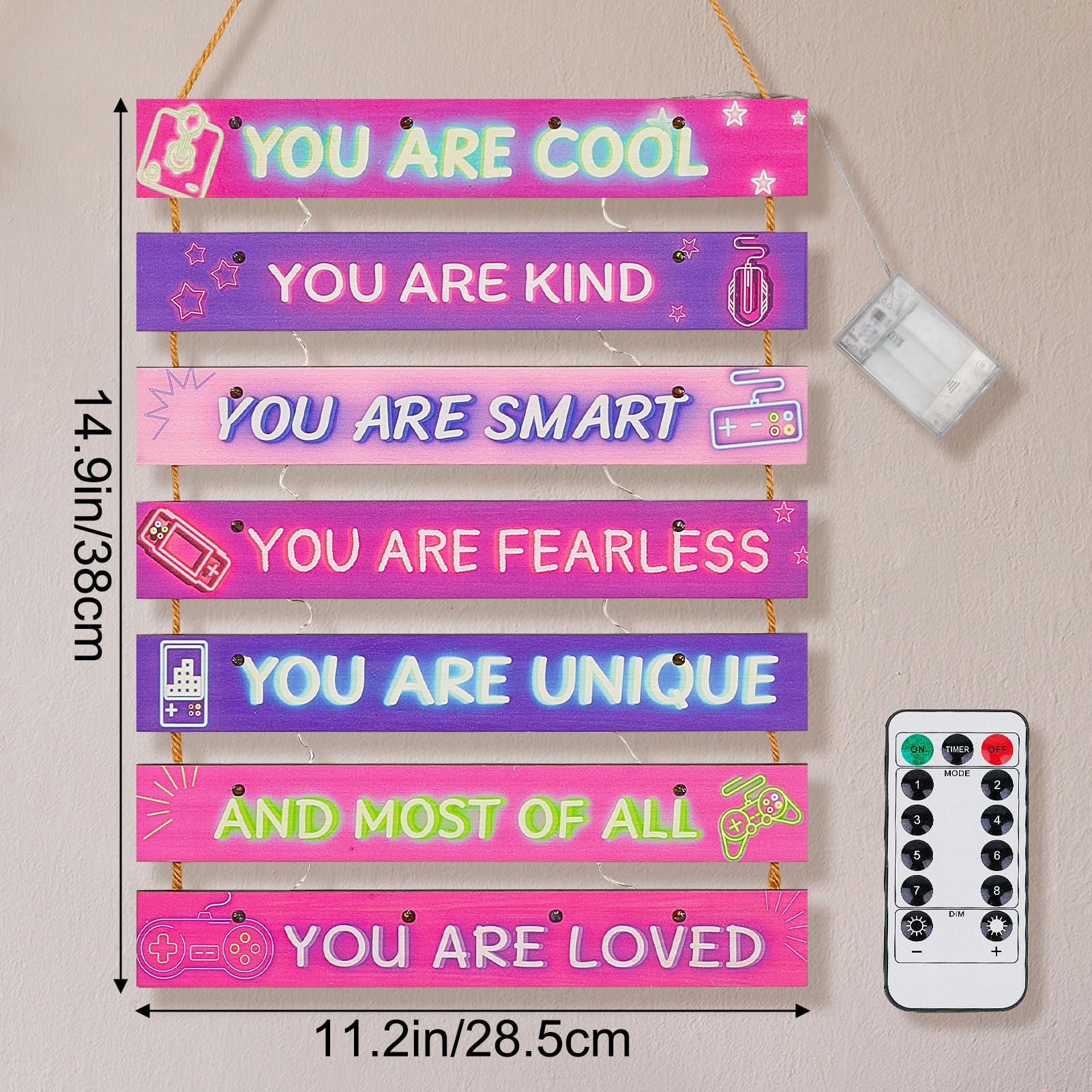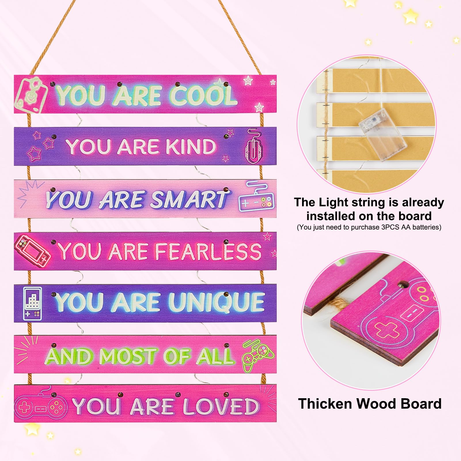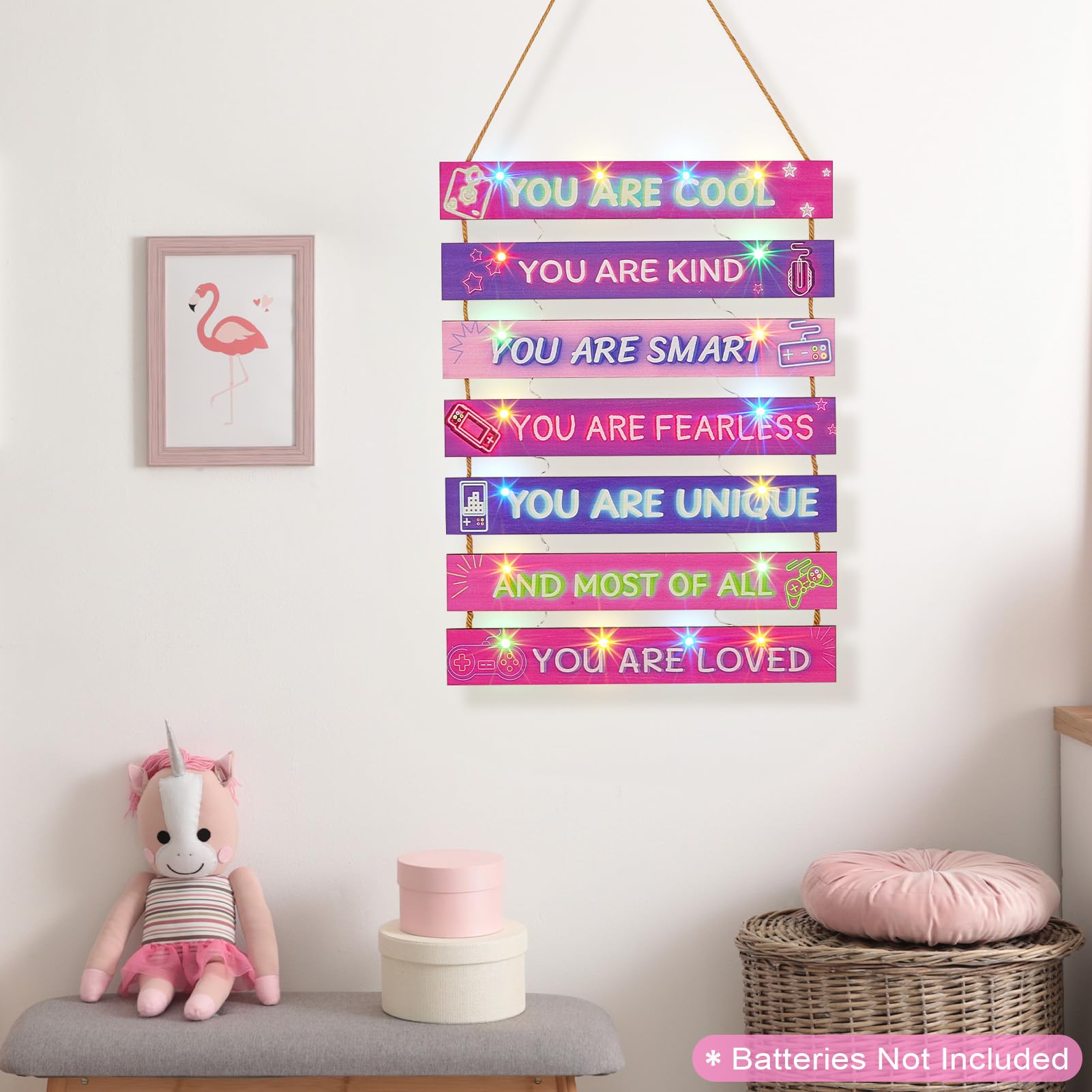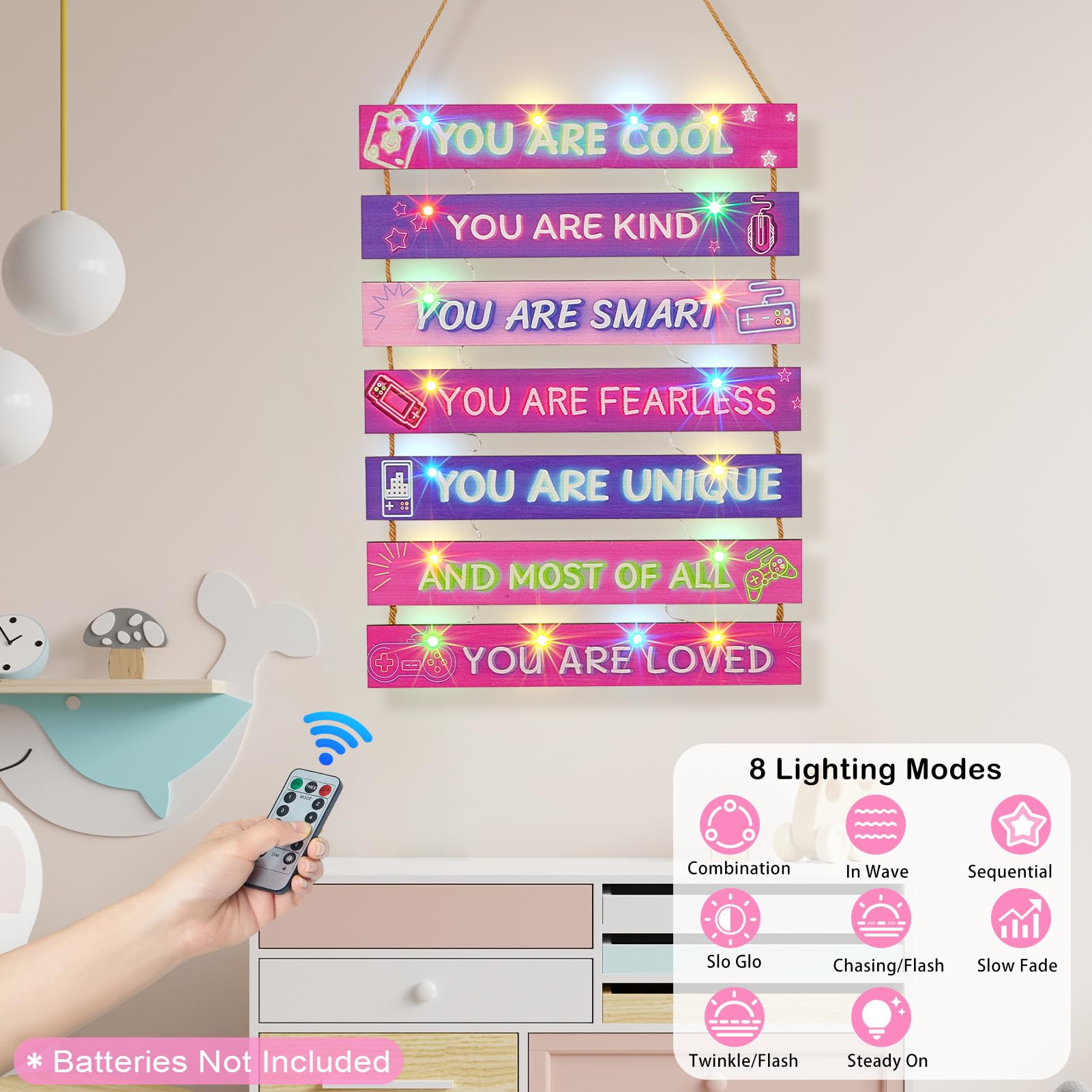 Package: The play room decor for kids package includeds 1 pcs girls room decor board, 1 pcs LED light with empty battery box (not including batteries), 1 pcs remote control (not including batteries), both do not including batteries, need to be purchased by customers themselves