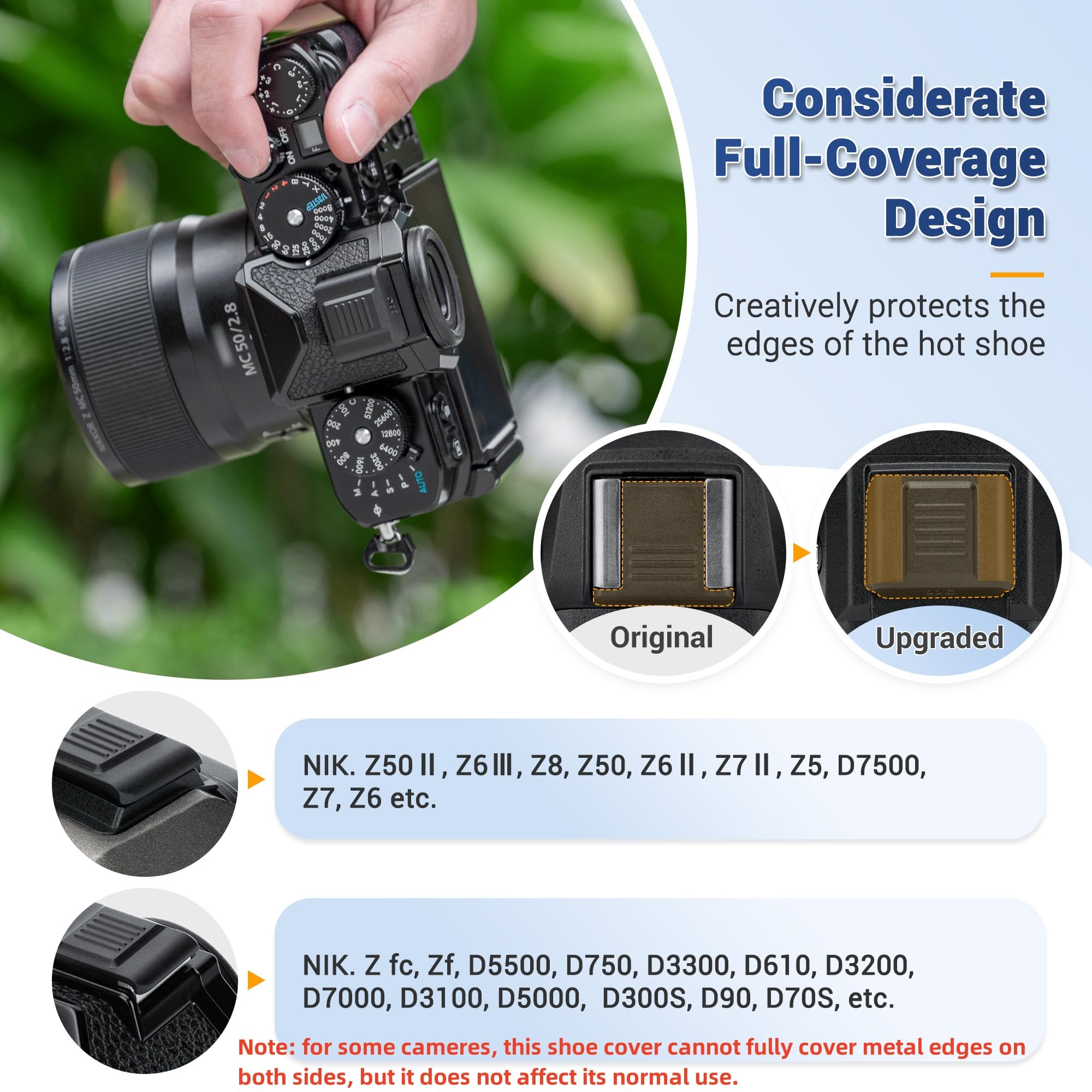 This hot shoe cover is specially designed for Nikon z5ii z5 ii z50 ii z6 iii z6 ii z7 ii z9 z8 z7 z6 z5 z50 z f z fc d5500 d750 d7000 d3300 d3200 d3100 d5000 d300S d90 d70s and more. NOTE: for some camera models, such as z f z fc d7000 d750 d5500 d3300 d3200 and more, this shoe cover cannot fully cover metal edges on both sides, but it does not affect its normal use.