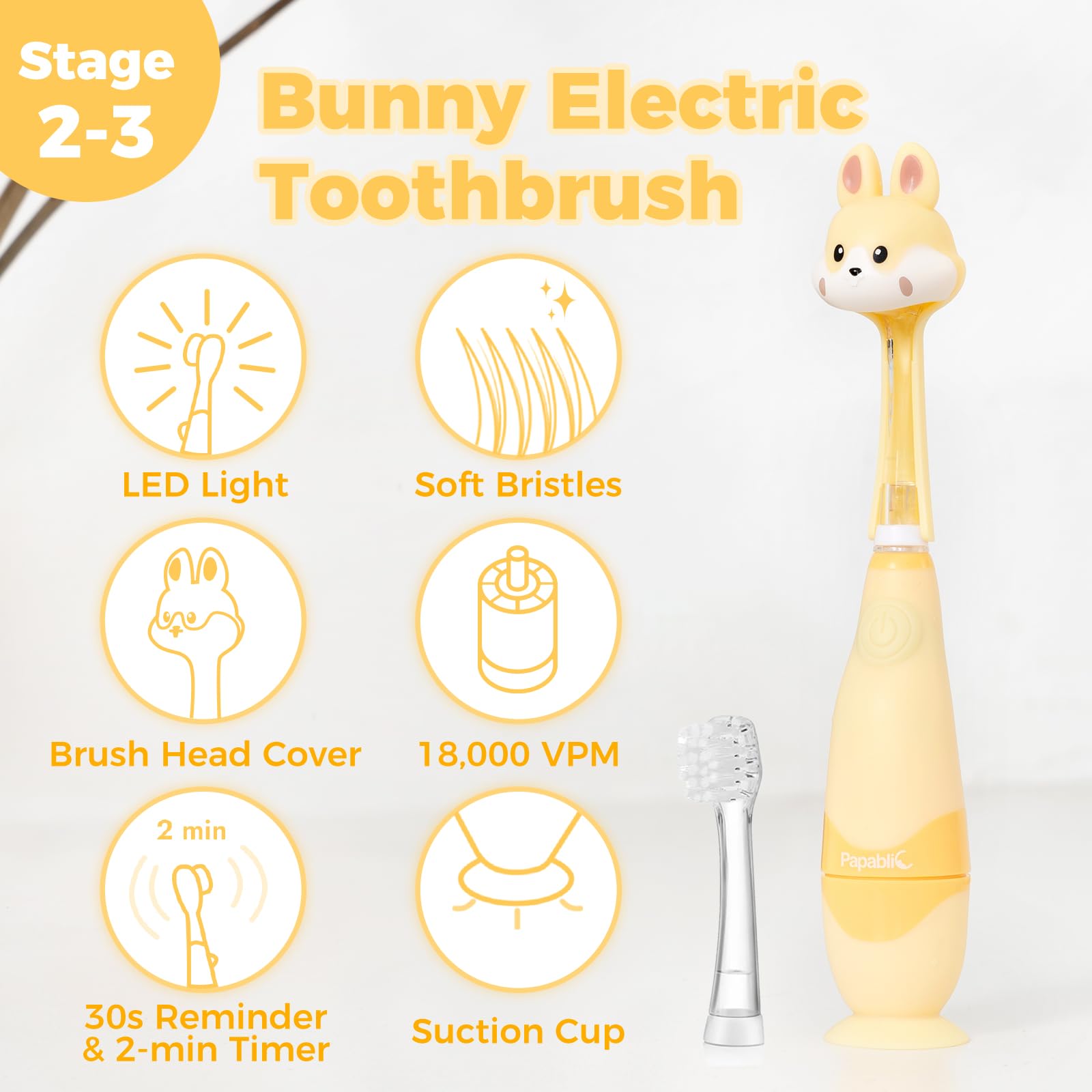 For 12+ Toddlers: This rabbit electric training toothbrush offers a deep clean with LED light and 18,000 vibrations per minute. The 2-minute timer with 30-second reminder supports good brushing habits, while two sizes detachable brush heads suit childs’ growing needs. A protective cover, suction base and included batteries make it convenient and hygienic for daily use.