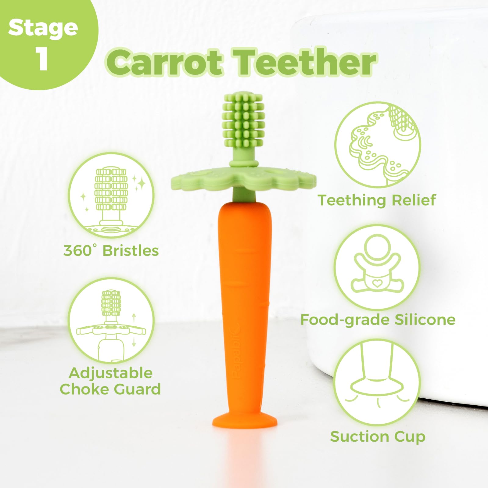 For 6+ Infants: This carrot baby toothbrush 6 to 12 months features 360˚ soft bristles for gentle gum relief and thorough cleaning. A built-in choke guard ensures safety, and the sturdy suction base keeps it upright and clean between uses.