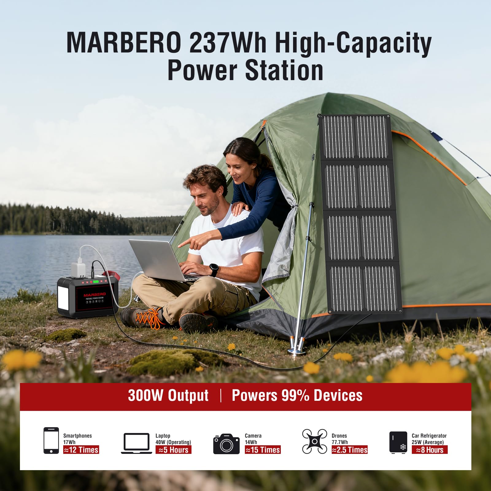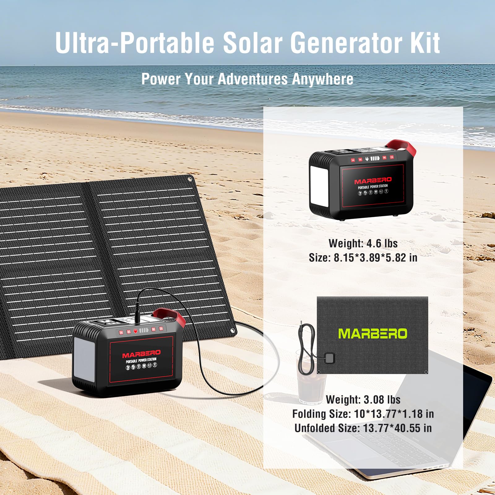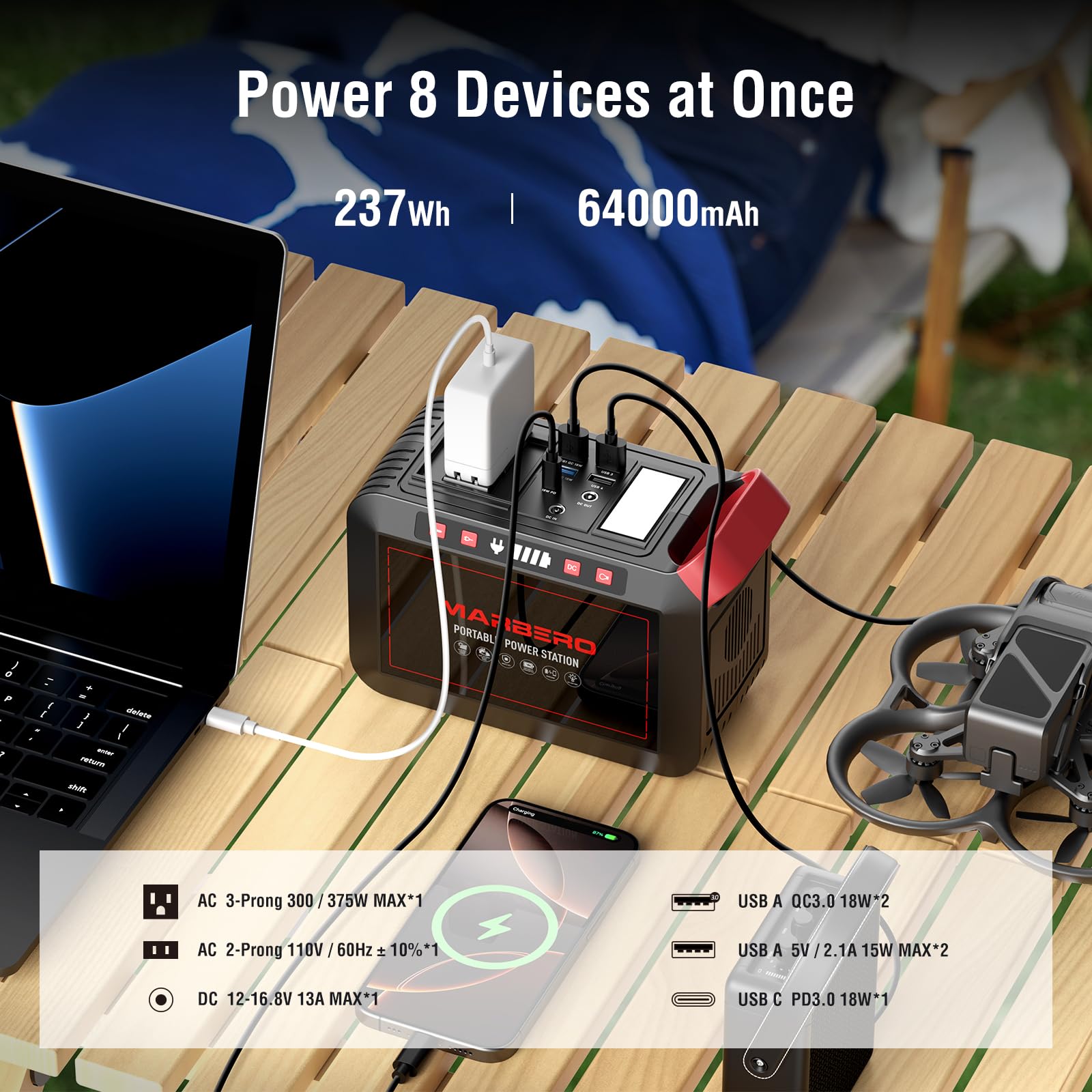 SOLAR POWERED GENERATOR WITH SOLAR PANEL INCLUDED: With a 237Wh/64000mAh high-quality lithium-ion battery pack, this MARBERO portable power station M823 is ideal for charging small devices like smartphones, tablets, laptops, and headphones and it's also perfect for outdoor adventures, even for overnight stays or extended periods off the grid. (NOTE: Using devices that exceed 300W may damage this portable generator, particularly those with heating elements and etc.)