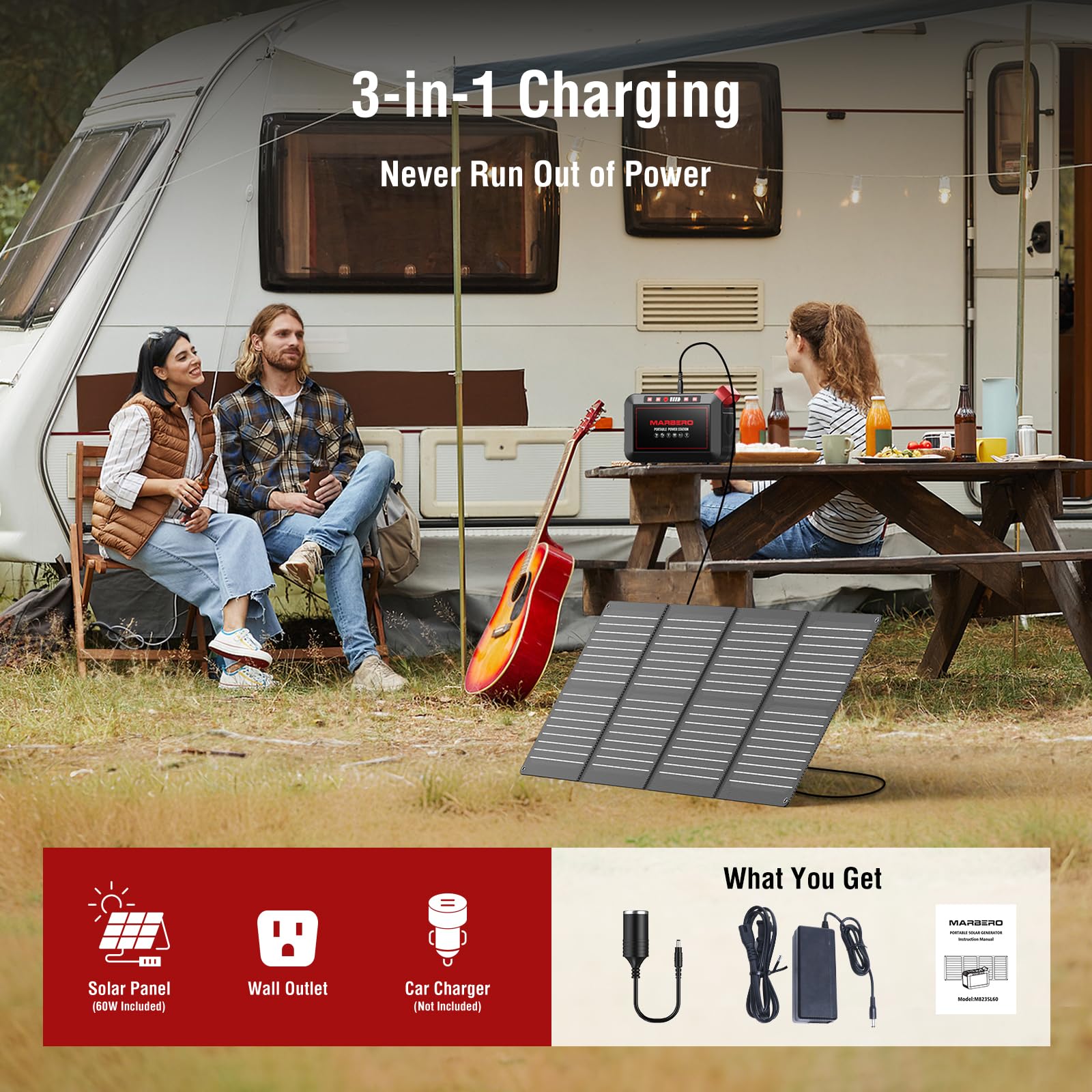 HOW TO USE TOGETHER: 1) Start by connecting the provided DC cable to the solar panel's DC port; 2) Next, select the appropriate DC adapter from the other end of the cable and attach it securely to your MARBERO portable power station solar generator M823; 3) Finally, place the solar panel in direct sunlight. The panel will efficiently convert solar power into electrical energy, which will then be transferred to your solar powered generator, ensuring you have reliable power whenever you need it.