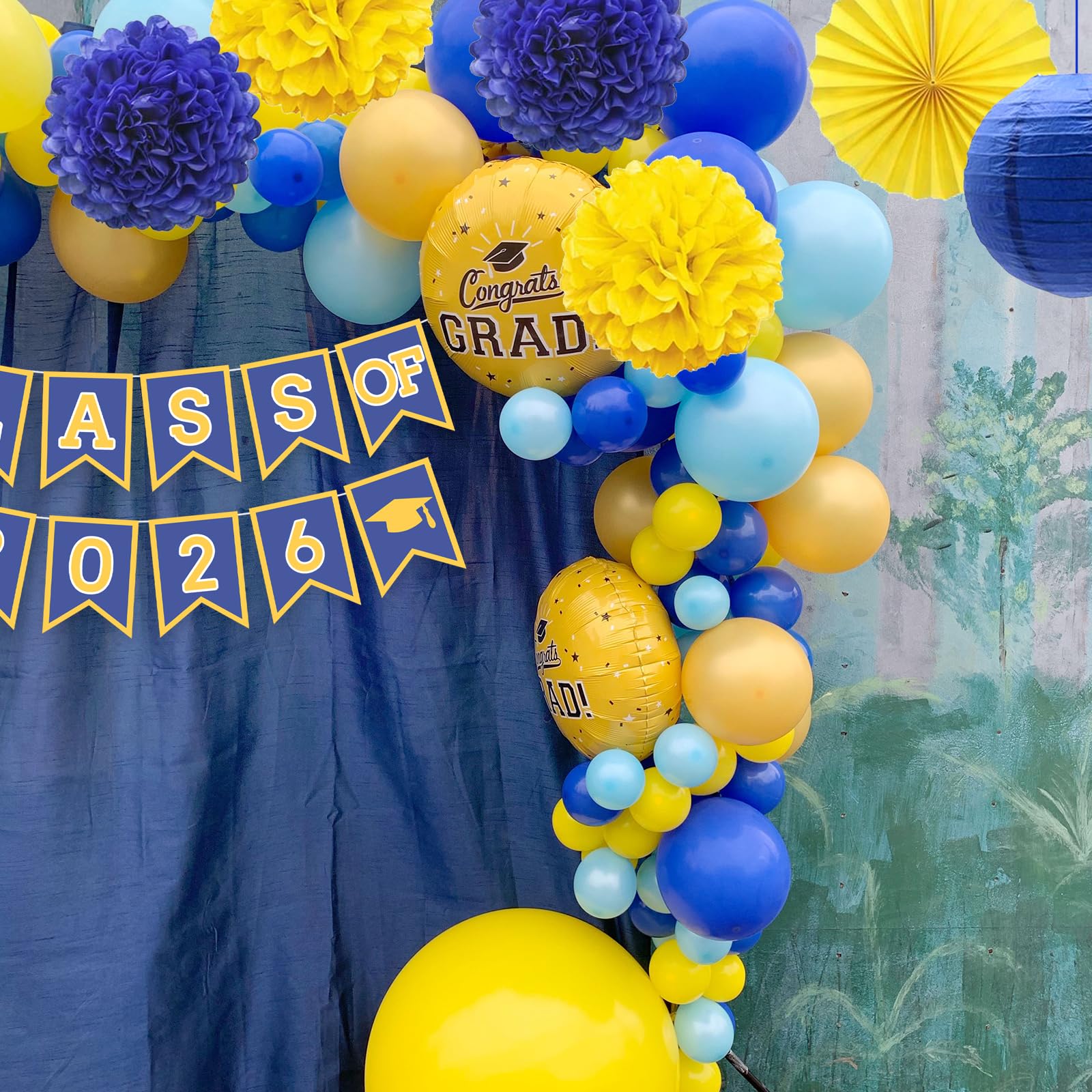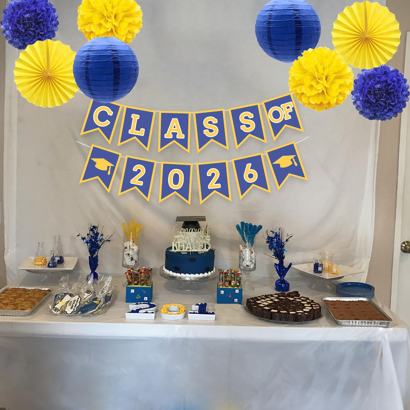 Quantity: 1 blue class of 2026 banner with 2 yellow gold grad caps, 2 blue pom poms flowers, 2 yellow pom poms flowers, 2 blue paper lanterns, 2 yellow paper fan flowers