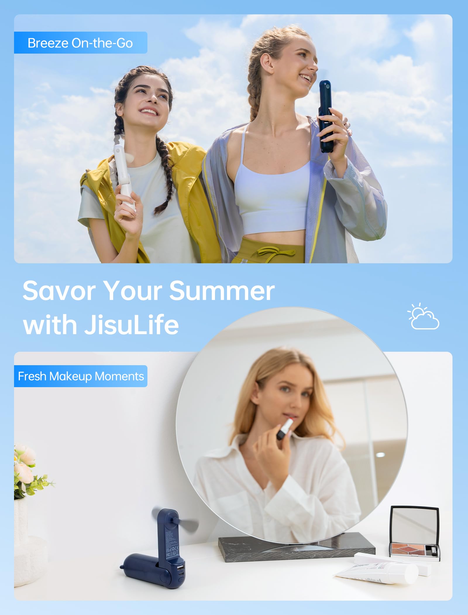 A Palm-sized Backup Charger: Designed with a pocket size, this portable fan easily fits into any bag for on-the-go convenience; Doubling as a backup power bank, it keeps your devices charged when needed, making it your travel and summer essentials