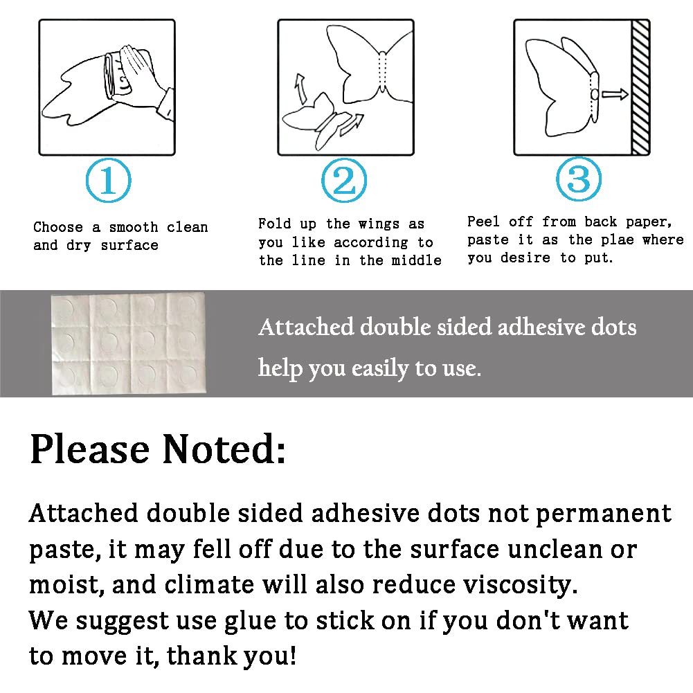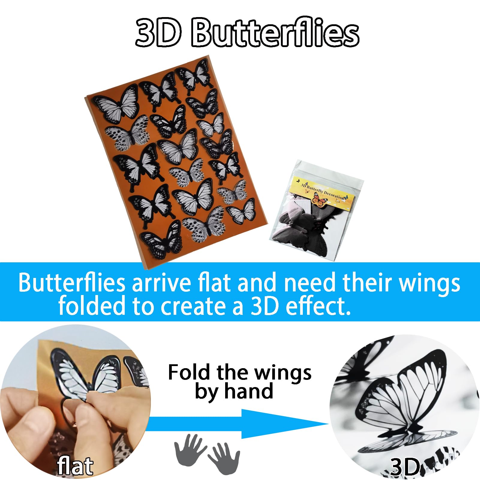 EASY TO USE: Black butterfly decoration is flat in the package when you first received, you have to fold the wings slightly to create a 3D effects. Cute butterfly decoration can be affixed on any dry, smooth and clean surface, including walls, doors, windows, mirrors, furniture, laptops or car windows. Butterfly decor set is a combined product, need glue adhesive strip on it before sticking on the wall. You can make their wings lift up and stand on artificial flowers