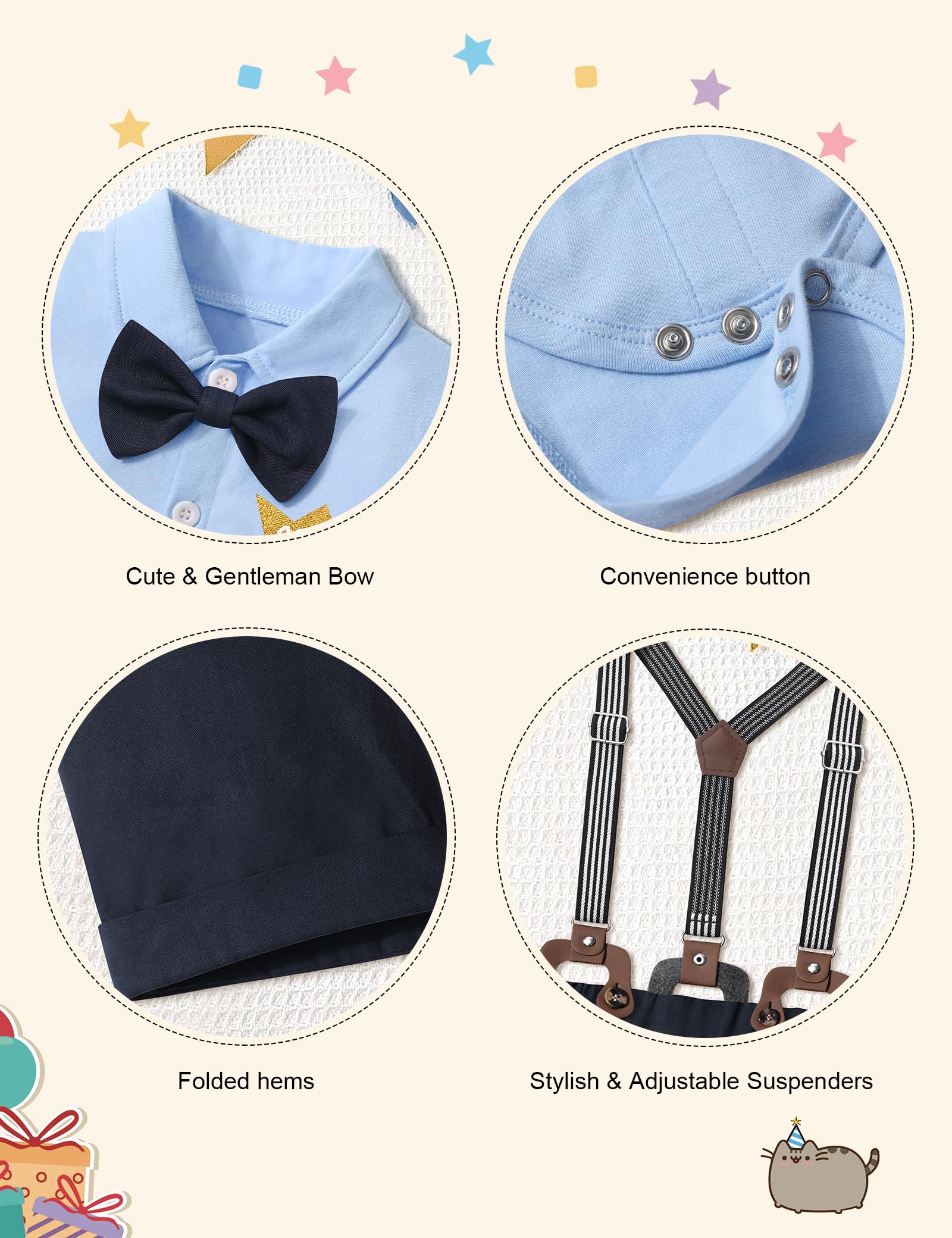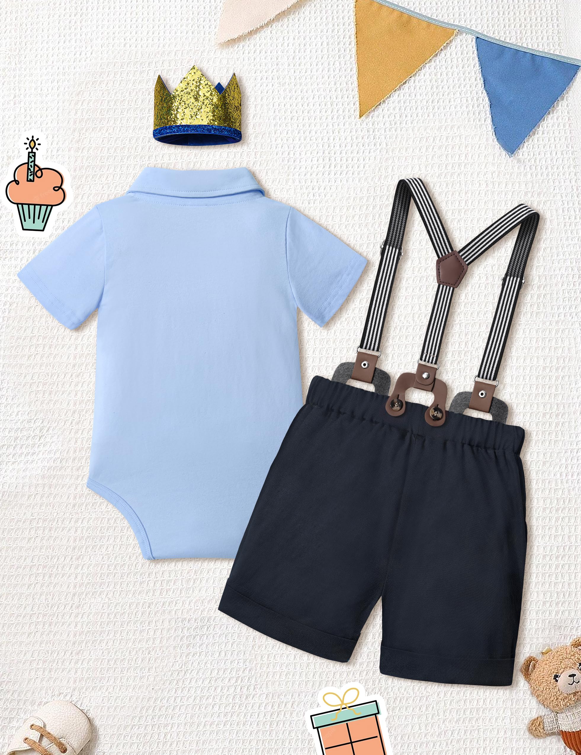 【Package Included】The baby boy first birthday outfit package includes 1 x short sleeve romper + 1 x Suspender Shorts + 1 x birthday crown. Go and buy one now! Your little boys will get lot of compliments from this outfits set. Please feel free to contact us if you have any questions