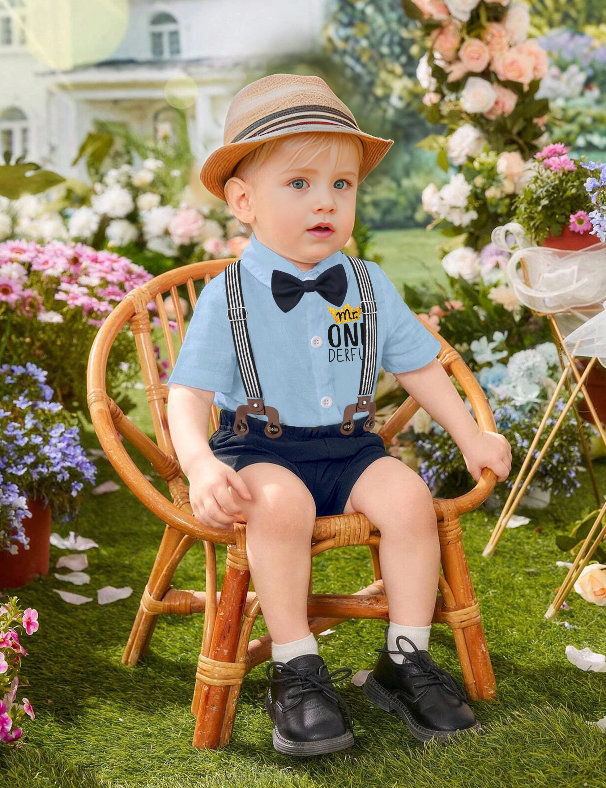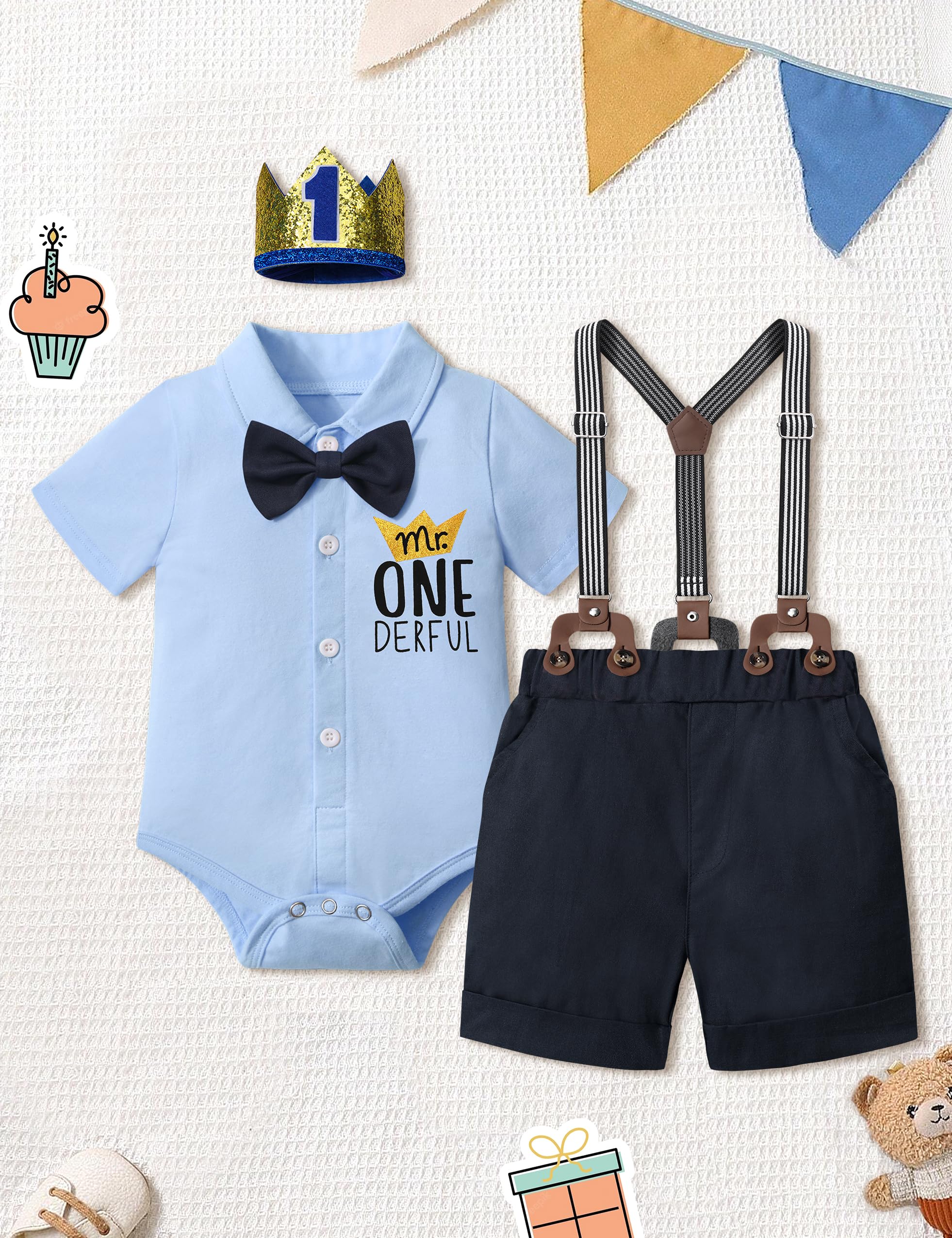 【Delicate Design】First birthday boy outfit come with a cute short sleeve romper tops , designed with MR ONEDERFUL letter print and delicate bow tie. The elastic waist shorts provide a comfortable wearing experience with 2 pockects. Adjustable Y-back suspenders designed, cute and fashionable. Matching birthday crown make your baby boy so adorable and gentlemen