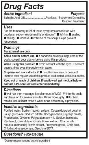 Control Scalp build-up and dandruff with MG217 Dandruff Shampoo and Conditioner, 3% Salicylic Acid Shampoo and Conditioner. Formulated with maximum strength 3% Salicylic Acid, this medicated dandruff shampoo & conditioner is a shampoo and conditioner for dry scalp and provides temporary relief from itching, flaking, and scalp irritation. Psoriasis, dandruff, and seborrheic dermatitis don't stand a chance against this medicated dandruff shampoo for scalp problems. This shampoo and conditioner soothes and moisturizes to repair, protect and control scalp build-up. Salicylic Acid is a doctor recommended active ingredient for the control of dandruff and helps prevent recurrence. Wet hair then massage liberal amount of MG217 into the scalp and leave on for several minutes. Rinse thoroughly. For best results, use at least twice a week or as directed by a physician.
