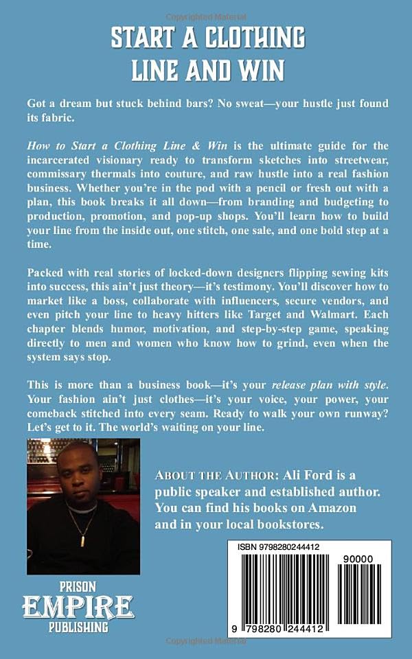 Got a dream but stuck behind bars? No sweat—your hustle just found its fabric. How to Start a Clothing Line & Win is the ultimate guide for the incarcerated visionary ready to transform sketches into streetwear, commissary thermals into couture, and raw hustle into a real fashion business. Whether you’re in the pod with a pencil or fresh out with a plan, this book breaks it all down—from branding and budgeting to production, promotion, and pop-up shops. You’ll learn how to build your line from the inside out, one stitch, one sale, and one bold step at a time. Packed with real stories of locked-down designers flipping sewing kits into success, this ain’t just theory—it’s testimony. You’ll discover how to market like a boss, collaborate with influencers, secure vendors, and even pitch your line to heavy hitters like Target and Walmart. Each chapter blends humor, motivation, and step-by-step game, speaking directly to men and women who know how to grind, even when the system says stop. This is more than a business book—it’s your release plan with style. Your fashion ain’t just clothes—it’s your voice, your power, your comeback stitched into every seam. Ready to walk your own runway? Let’s get to it. The world’s waiting on your line.