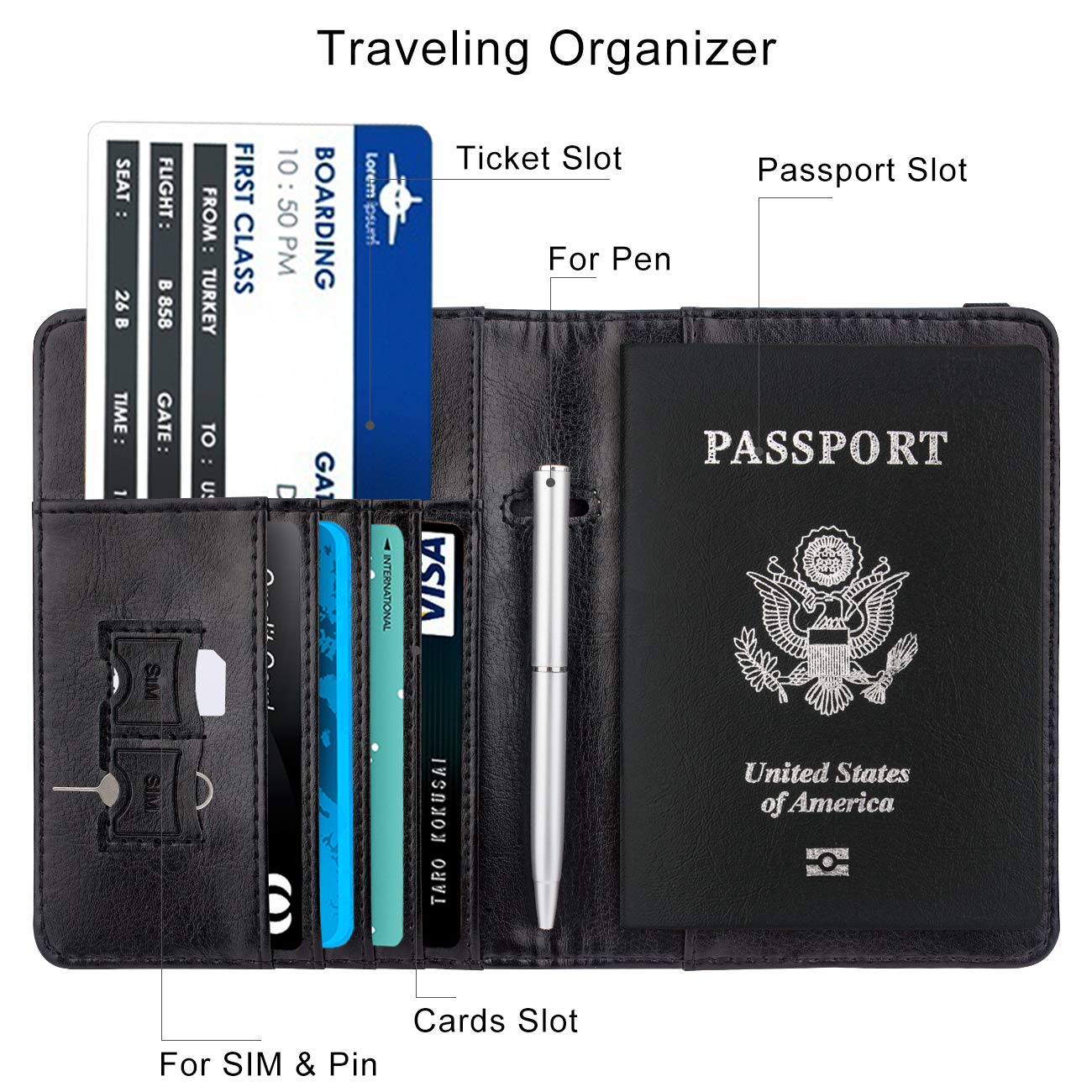 Practical Travel Accessories: This passport cover and card wallet has multiple slots to hold business cards, credit cards, cash, boarding passes sufficiently, two SIM slots for SIM cards, a pen slot for pen. Allows convenient access to information during boarding and transit