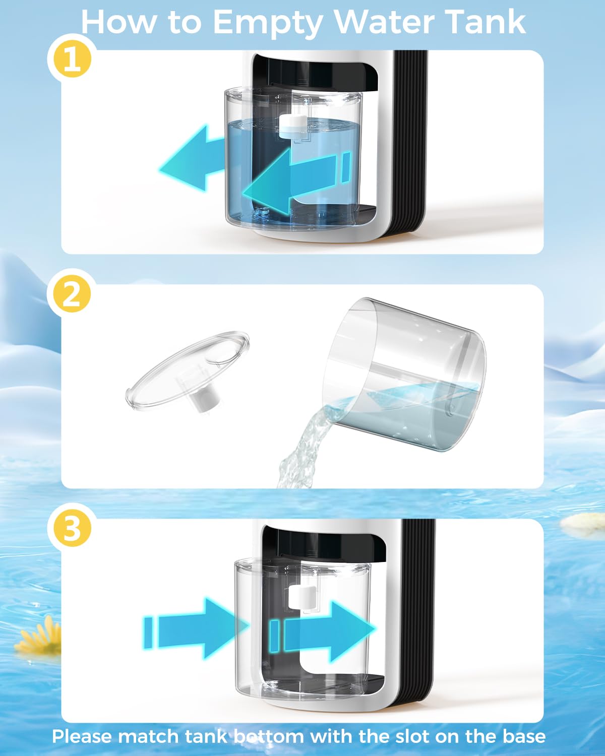 Portable & Compact Dehumidifier: Easy to place anywhere. Lightweight and portable, this dehumidifiers for home can be positioned in various spaces such as the bedroom, bathroom, closet, kitchen, cabinet, garage, RV, and more. Say goodbye to damp troubles with this efficient solution! (Power: 40 watts. Water Tank: 42oz/1200ml. Size: 5.6"D x 6.37"W x 11"H)