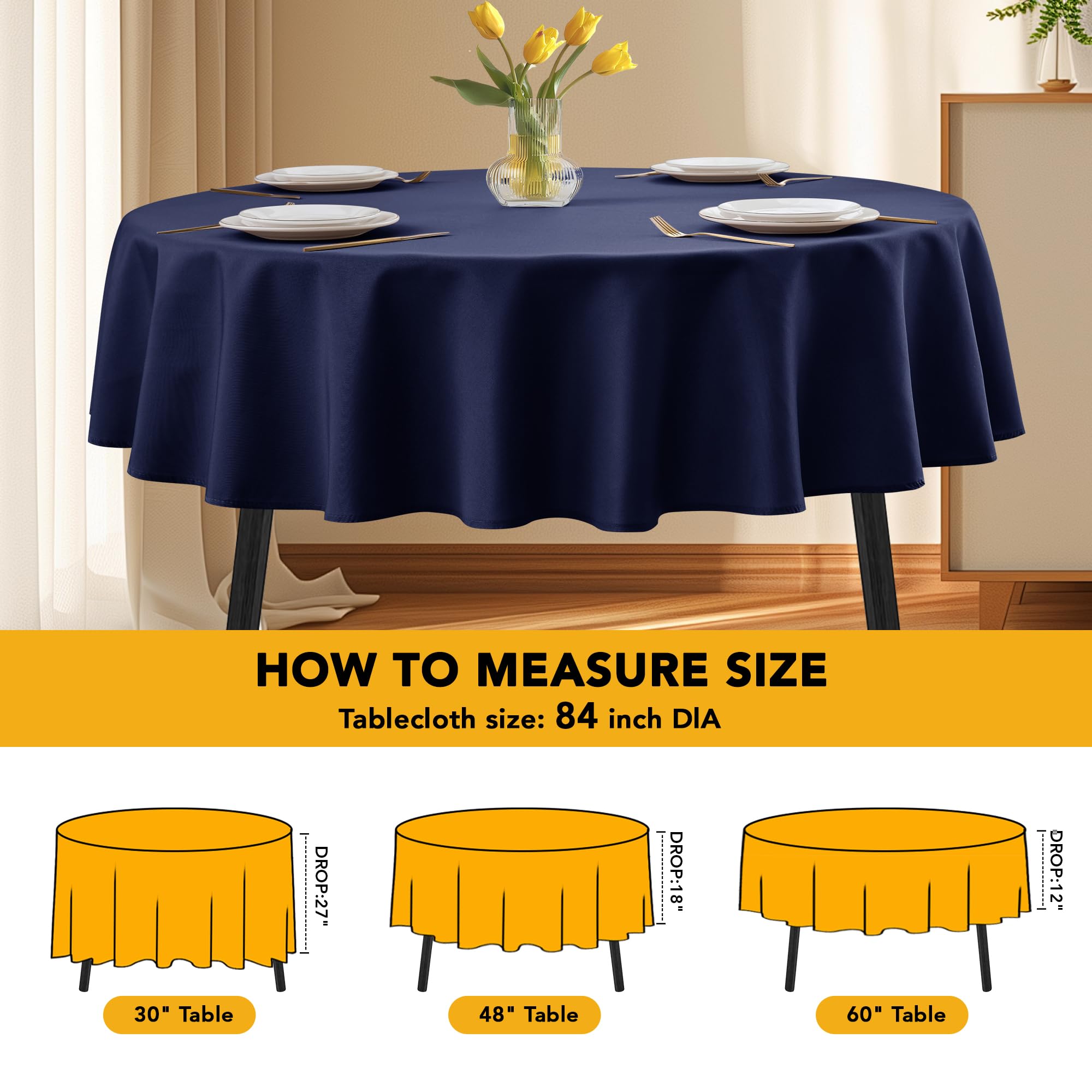 TAILORED FIT FOR 3-5 FT ROUND TABLES: Designed for 3-foot round tables, these 84-inch tablecloths fit up to 5 feet, offering a snug, no-slip drape for a polished setup