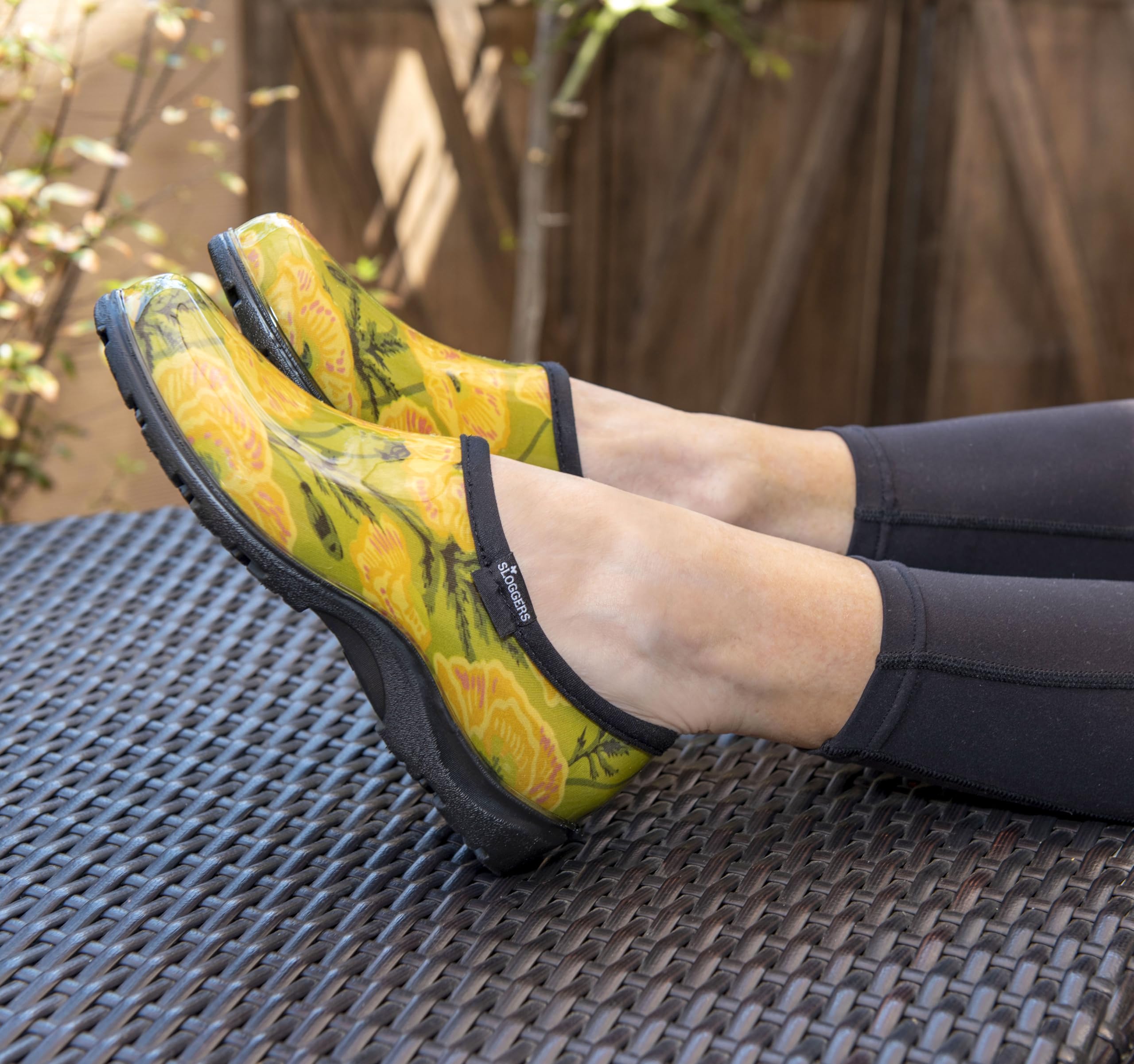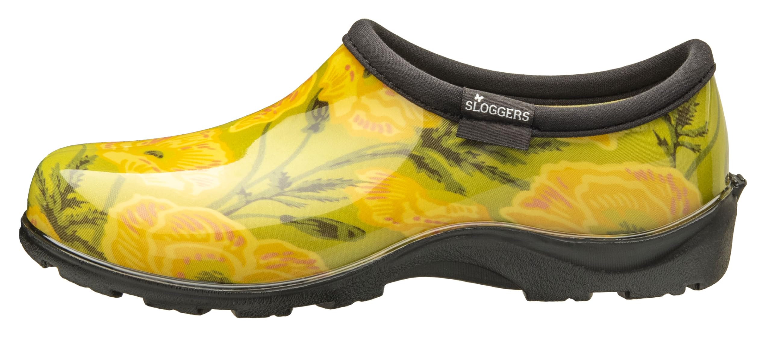 Description Product Description Slip into waterproof comfort with Sloggers Horses Black Print rain and garden shoes. Features our "All-Day Comfort" insoles for maximum comfort and our signature deep profile for great traction. Easy to install and clean. You'll soon know why Sloggers are America's #1 backdoor shoe. Note: prints may vary slightly from shoe to shoe. Ladies 6-18 Made in USA. Amazon.com Cultivate all the enjoyment you can from your garden in the Midsummer garden shoe from Sloggers. Brilliant floral design meets mud- and puddle-proof construction so you can get out there after a refreshing spring shower and stay decidedly un-soggy. A low-cut ankle offers range of motion for easier kneeling and squatting as you work the soil. From the Manufacturer Women's Garden Shoe Midsummer, 6, (Black), Ea.