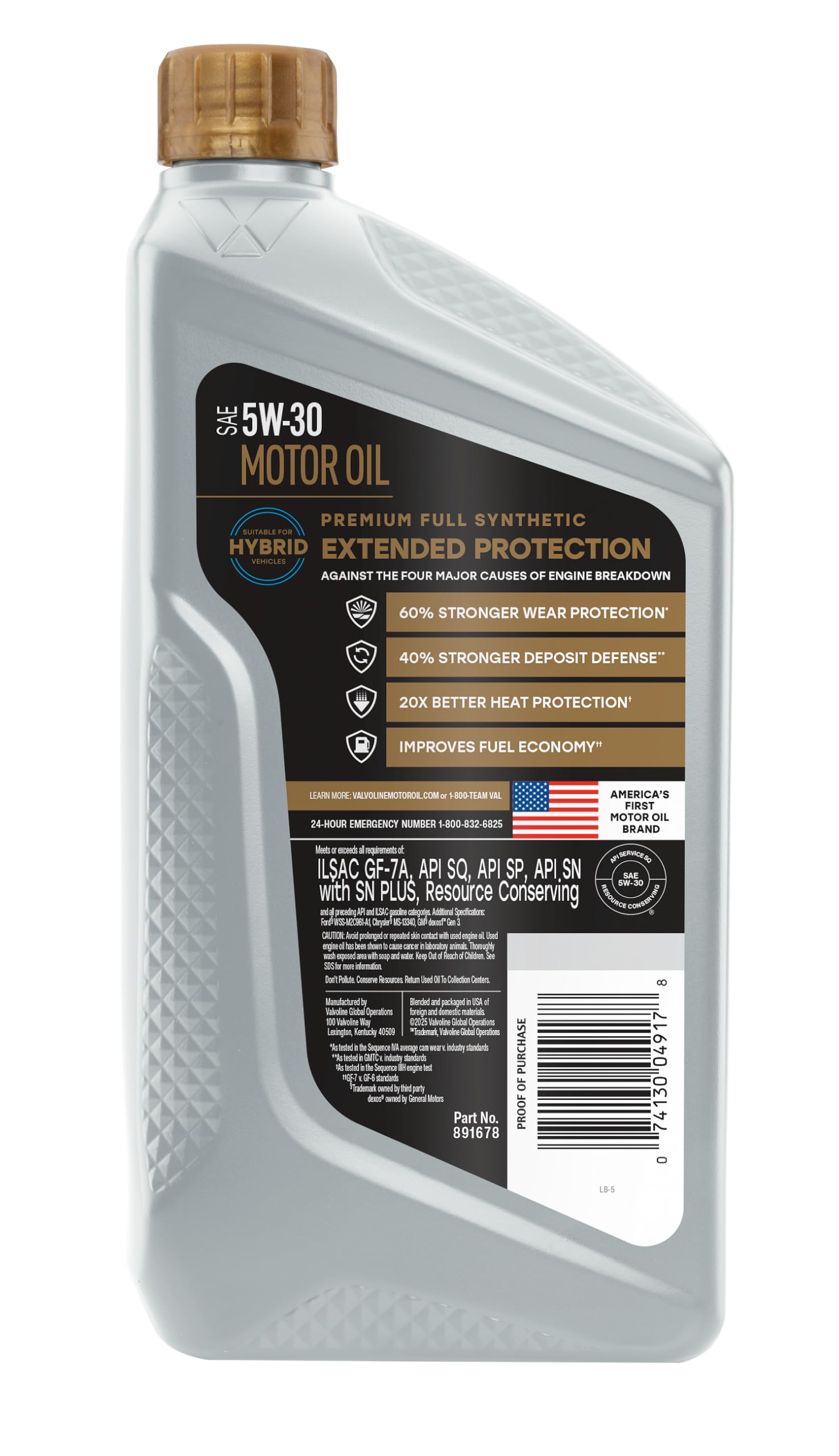 Premium motor oil isn’t just for sports cars or luxury vehicles. Today’s engines produce more horsepower in a smaller package to improve fuel efficiency without sacrificing performance. Because engines are working harder, they demand next-level protection. Valvoline Extended Protection Full Synthetic Motor Oil provides superior protection from deposits, wear, heat and friction – the four major causes of engine breakdown. Our Dual Defense Additive Technology combines an innovative additive booster with a fortified detergent system to fight sludge and help keep engines clean for optimal performance and fuel efficiency. Valvoline Extended Protection Full Synthetic is 10x stronger against oil breakdown and offers 24x stronger protection against engine-killing contaminants than the industry-leading full synthetic. And thanks to an exceptional range of temperature protection, your engine will be ready for extreme summer heat or frigid winter weather. Formulated to exceed the latest industry engine oil specifications (API SP, ILSAC GF-6 and GM dexos1), Valvoline Extended Protection Full Synthetic is our best oil, and your best choice, whether you drive a Toyota Camry, Ford F150, Chevy Silverado or anything in between.